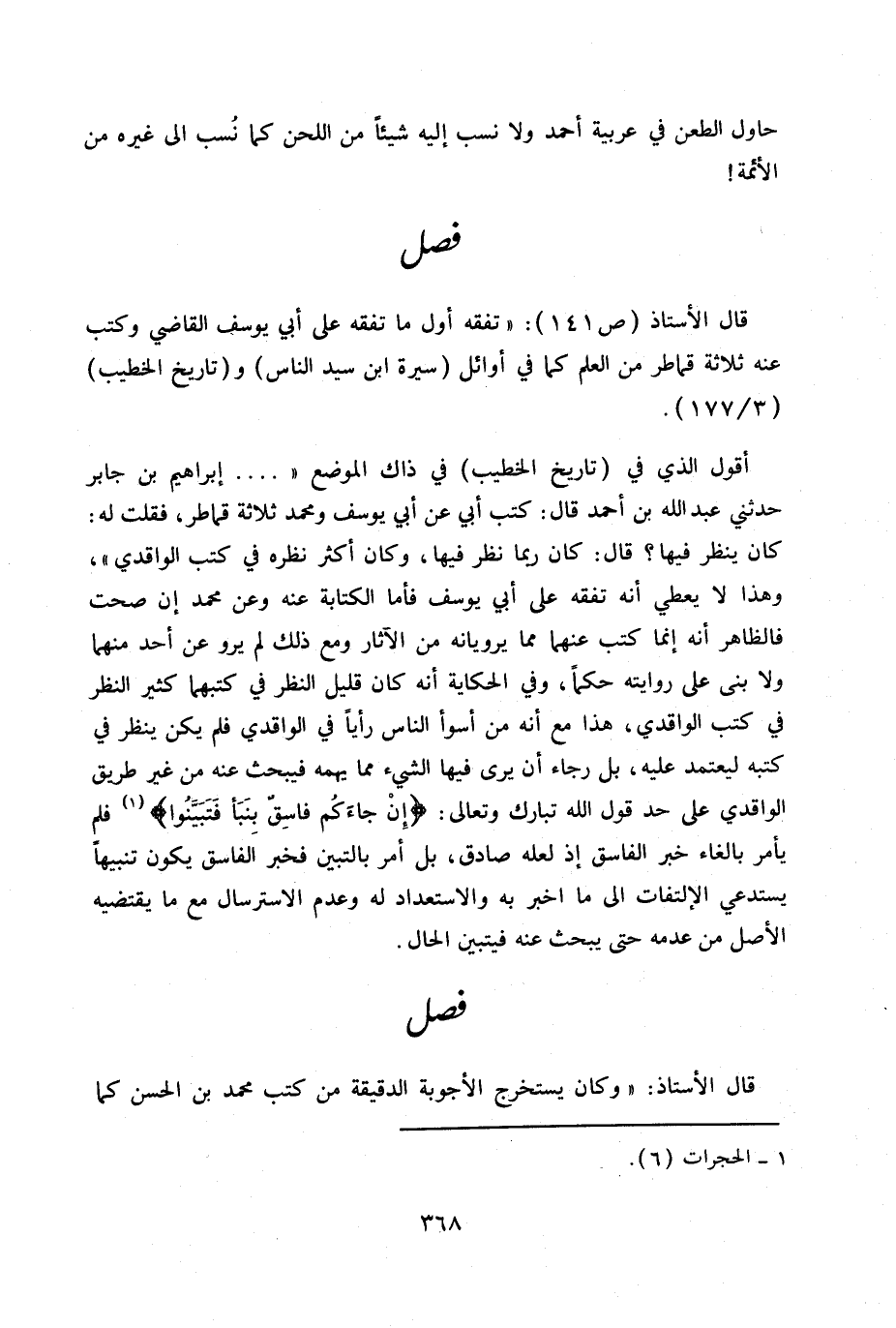 أقول الذي في (تاريخ الخطيب) في ذاك الموضع « ... إبراهيم بن جابر حدثني عبد الله ابن أحمد قال كتب أبي عن يوسف ومحمد ثلاثة قماطر، فقلت له كان ينظر فيها؟ قال كان ربما نظر فيها، وكان أكثر نظره في كتب الواقدي» ، وهذا لا يُعطى أنه تفقه على أبي يوسف فأما الكتابة عنه وعن محمد إن صحت فالظاهر أنه إنما كتب عنهما مما يرويانه من الآثار ومع ذلك لم يروعن أحد منهما ولا بنى على رويته حكماً. وفي الحكاية أنه كان قليل النظر في كتبهما كثير النظر في كتب الواقدي، هذا مع أنه من أسوأ الناس رأياً في الواقدي فلم يكن ينظر في كتبه ليعتمد عليه، بل رجاء أن يرى فيها الشيء مما يهمه فيبحث عنه من غير طريق الواقدي على حد قول الله تبارك وتعالى: {إِنْ جَاءكُمْ فَاسِقٌ بِنَبَأٍ فَتَبَيَّنُوا} فلم يأمر بإلغاء خبر الفاسق إذ لعله صادق، بل أمر بالتبين فخبر الفاسق يكون تنبيهاً يستدعي الالتفات إلى ما أخبر به والاستعداد له وعدم الاسترسال مع ما يقتضيه الأصل من عدمه حتى يبحث عنه فيتبين الحال.