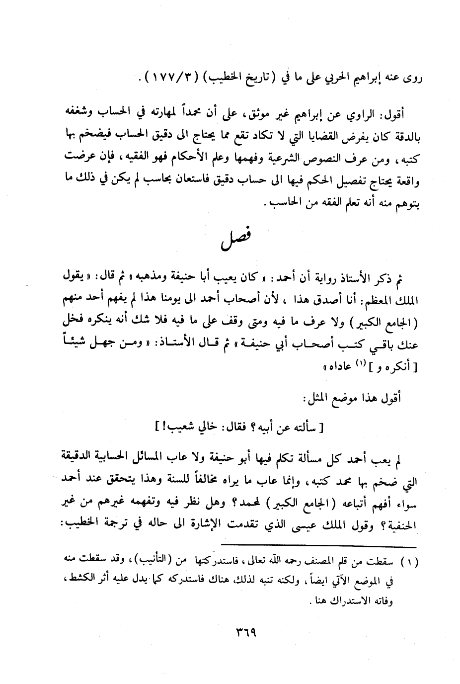 أقول الراوي عن إبراهيم غير موثق، على أن محمداً لمهارته في الحساب وشغفه بالدقة كان يفرض القضايا التي لا تكاد تقع مما يحتاج إلى دقيق الحساب فيضخم بها كتبه. ومن عرف النصوص الشرعية وفهمها وعلم الأحكام فهو الفقيه، فإن عرضت واقعة يحتاج إلى تفصيل الحكم فيها إلى حساب دقيق فاستعان بحاسب لم يكن في ذلك ما يتوهم منه أنه تعلم الفقه من الحاسب.