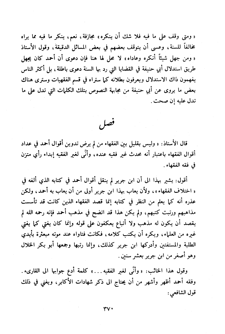 أقول يشير بهذا إلى أن ابن جرير لم ينقل أقوال أحمد في كتابه الذي ألفه في «اختلاف الفقهاء» ، ولأن يعاب بهذا ابن جرير أولى من أن يعاب به أحمد، ولكن عذره أمه كما يعلم من النظر في كتابه إنما قصد الفقهاء الذين كانت قد تأسست مذاهبهم ورتبت كتبهم، ولم يكن هذا قد اتضح في مذهب أحمد فإنه رحمه الله لم يقصد أن يكون له مذاهب ولا أتباع يعكفون على قوله وإنما كان يفتي كما يفتي غيره من العلماء، ويكره أن يكتب كلامه، فكانت فتاواه عند موته مبعثرة بأيدي الطلبة والمستفتين وأدركها ابن جرير كذلك، وإنما رتبها وجمعها أبو بكر الخلال وهو أصغر من ابن جرير بعشر سنين.