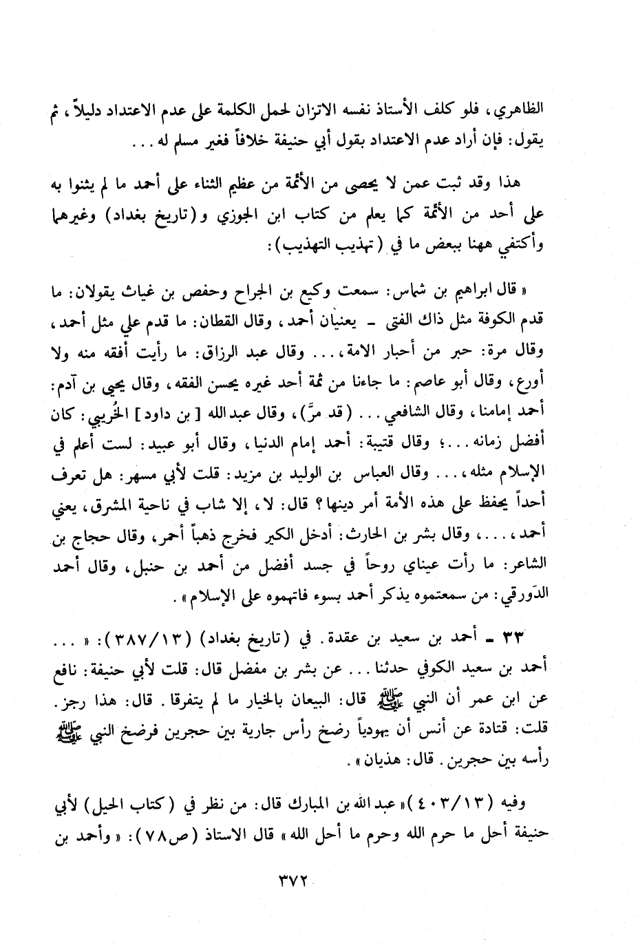 وفيه (13/ 403) عبد الله بن المبارك قال: من نظر في (كتاب الحيل) لأبي حنيفة أحل ما حرم الله وحرم ما أحل الله» قال الأستاذ ص 78 «وأحمد بن