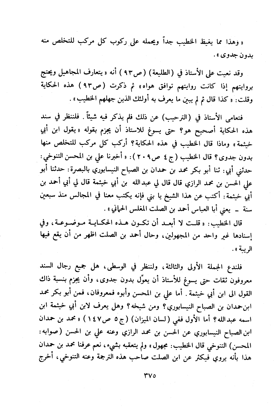 وقد نعيت على الأستاذ في (الطليعة) ص 93 أنه «يتعارف المجاهيل ويحتج بروايته إذا كانت روايتهم توافق هواه» ص93 أنه «يتعارف المجاهيل ويحتج بروايتهم إذا كانت روايتهم توافق هواه» ثم ذكرت ص93 هذه الحكاية وقلت «كذا قال ثم لم يبين ما يعرف به أولئك الذين جهلهم الخطيب» .