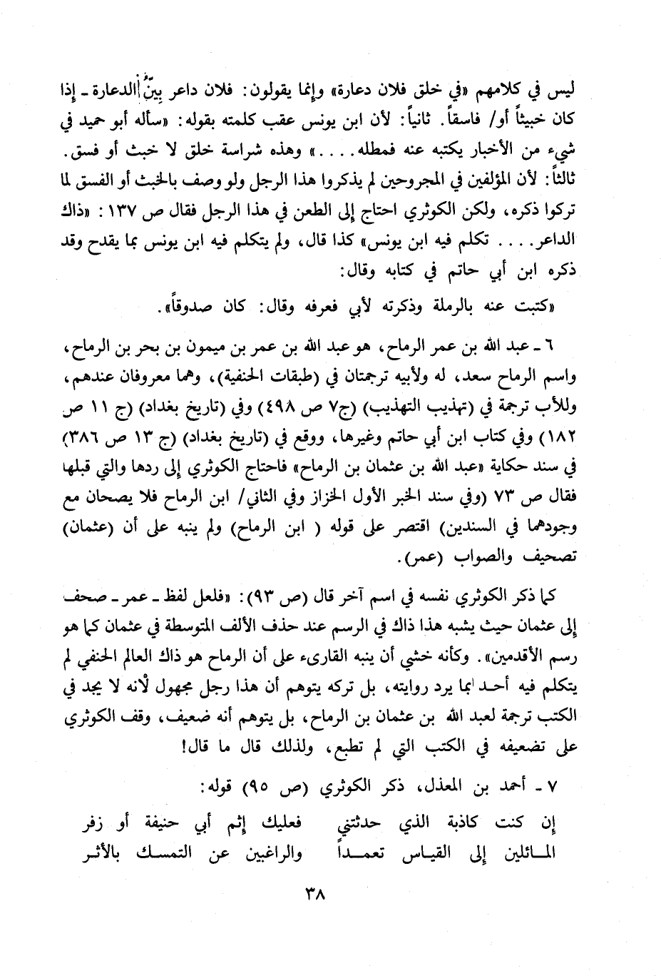 7- عبد الله بن عمر الرماح، هو عبد الله بن عمر بن ميمون بن بحر بن الرماح، واسم الرماح سعد، له ولأبيه ترجمتان في (طبقات الحنفية) ، وهما معروفان عندهم، وللأب ترجمة في (تهذيب التهذيب) (ج 7 ص 498) وفي (تاريخ بغداد) (ج 11 ص 182) وفي كتاب ابن أبي حاتم وغيرها، ووقع في (تاريخ بغداد) (ج 13 ص 386) في سند حكاية «عبد الله بن عثمان بن الرماح» فاحتاج الكوثري إلى ردها والتي قبلها فقال ص 73 (وفي سند الخبر الأول الخزاز وفي الثاني ابن الرماح فلا يصحان مع وجودهما في السندين) اقتصر على قوله (ابن الرماح) ولم يتنبه على أن (عثمان) تصحيف والصواب (عمر) . كما ذكر الكوثري نفسه في اسم آخر قال ص 93: «فلعل لفظ - عمر - صحف إلى عثمان حيث يشبه هذا ذاك في الرسم عند حذف الألف المتوسطة في عثمان كما هو رسم الأقدمين» .