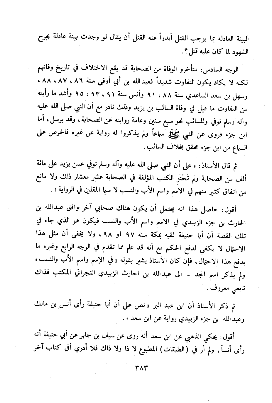 أقول حاصل هذا أنه يحتمل أن يكون هناك صحابي آخر وافق عبد الله بن الحارث بن جزء الزبيدي في الاسم واسم الأب والنسب فيكون هو الذي جاء في تلك القصة أن أبا حنيفة لقيه بمكة سنة 97 أو 98، ولا يخفى أن مثل هذا الاحتمال لا يكفي لدفع الحكم مع أنه قد علم مما تقدم في الوجه الرابع وغيره ما يدفع هذا الاحتمال، فإن كان الأستاذ يشير بقوله «في الاسم واسم الأب والنسب» ولم يذكر اسم الجد - إلى عبد الله بن الحارث الزبيدي النجراني المكتب فذاك تابعي معروف.