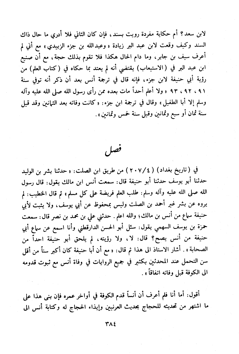 في (تاريخ بغداد) 4/207 من طريق ابن الصلت «حدثنا بشر بن الوليد حدثنا أبو يوسف حدثنا أبو حنيفة قال سمعت أنس ابن مالك يقول قال رسول الله صلى الله عليه وآله وسلم: طلب العلم فريضة على كل مسلم» ثم قال الخطيب: لم يروه عن بشر غير أحمد بن الصلت وليس بمحفوظ عن أبي يوسف، ولا يثبت لأبي حنيفة سماع من أنس بن مالك. والله أعلم. حدثني علي بن محمد بن نصر قال سمعت حمزة بن يوسف السهمي يقول سئل أبو الحسن الدارقطني وأنا أسمع عن سماع أبي حنيفة من أنس يصح؟ قال: لا ولا رؤيته، لم يلحق أبو حنيفة أحداً من الصحابة» أشار الأستاذ إلى هذا ثم قال: «مع أن أبا حنيفة كان أكبر سناً من أقل سن التحمل عند المحدثين بكثير في جميع الروايات في وفاة أنس مع ثبوت قدومه إلى الكوفة قبل وفاته اتفاقاً» .