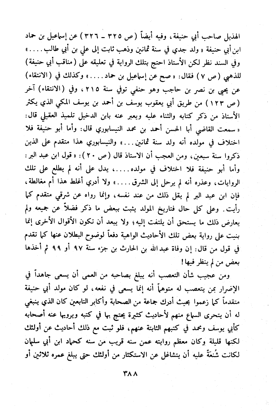 الهذيل صاحب أبي حنيفة، وفيه أيضاً ص 325- 326 عن إسماعيل بن حماد بن أبي حنيفة «ولد جدي في سنة ثمانين وذهب ثابت إلى علي بن أبي طالب ... » وفي السند نظر لكن الأستاذ أحتج بتلك الرواية في تعليقه على «مناقب أبي حنيفة» الذهبي ص 7 وقال «صح عن إسماعيل بن حماد ... » وكذلك في «الانتقاء» عن يحيى بن نصر بن حاجب وهو حنفي توفي سنة 215، وفي «الانتقاء» آخر ص 123 من طريق أبي يعقوب يوسف ابن أحمد بن يوسف المكي الذي يكثر الأستاذ من ذكر كتابه والثناء عليه يعبر عنه بابن الدخيل تلميذ العقيلي قال «سمعت القاضي أبي الحسن أحمد بن محمد النيسابوري قال: وأما أبو حنيفة فلا اختلاف في مولده أنه ولد سنة ثمانين ... » والنيسابوري هذا متقدم على الذين ذكروا سنة سبعين، ومن العجب أن الأستاذ قال ص 20 «قول ابن عبد البر: وأما أبو حنيفة فلا اختلاف في مولده ... ، يدل على أنه لم يطلع على تلك الروايات، وعذره انه لم يرحل إلى الشرق ... » ولا أدري أغلط هذا أم مخالطة، فأن ابن عبد البر لم يقل ذلك من عند نفسه، وإنما رواه عن شرقي متقدم كما رأيت. وعلى كل حال فتاريخ المورد لم يثبت ببعض ما ذكر فضلاً عن جميعه ولم يعارض ذلك ما يستحق أن يلتفت إليه. ولا يبعد أن تكون الأقوال الأخرى. إنما بنيت على رواية على بعض تلك الأحاديث الواهية دفعاً لوضوح البطلان عنها كما تقدم في قول من قال: أن وفاة عبد الله ابن الحارث بن جزء سنة 97 أو 99 ثم أخذها بعض من لم ينظر فيها! ومن عجيب شأن التعصب أنه يبلغ بصاحبه من العمى أن يسعى جاهداً في الإضرار بمن يتعصب له متوهماً أنه أنما يسعى في نفعه، لو كان مولد أبي حنيفة متقدماً كما زعموا بحيث أدرك جماعة من الصحابة وأكابر التابعين كان الذي ينبغي له يتحرى له أنه السماع منهم لأحاديث كثيرة يحتج بها في كتبه ويرويها عنه أصحابه كأبي يوسف ومحمد في كتبهم الثابتة عنهم، فلو ثبت مع ذلك أحاديث عن أولئك لكنها قليلة وكان معظم روايته عمن سنه قريب من سنه كحماد ابن أبي سليمان لكانت شُنْعَةً عليه أن يتشاغل عن الاستكثار من أولئك حتى يبلغ عمره ثلاثين أو