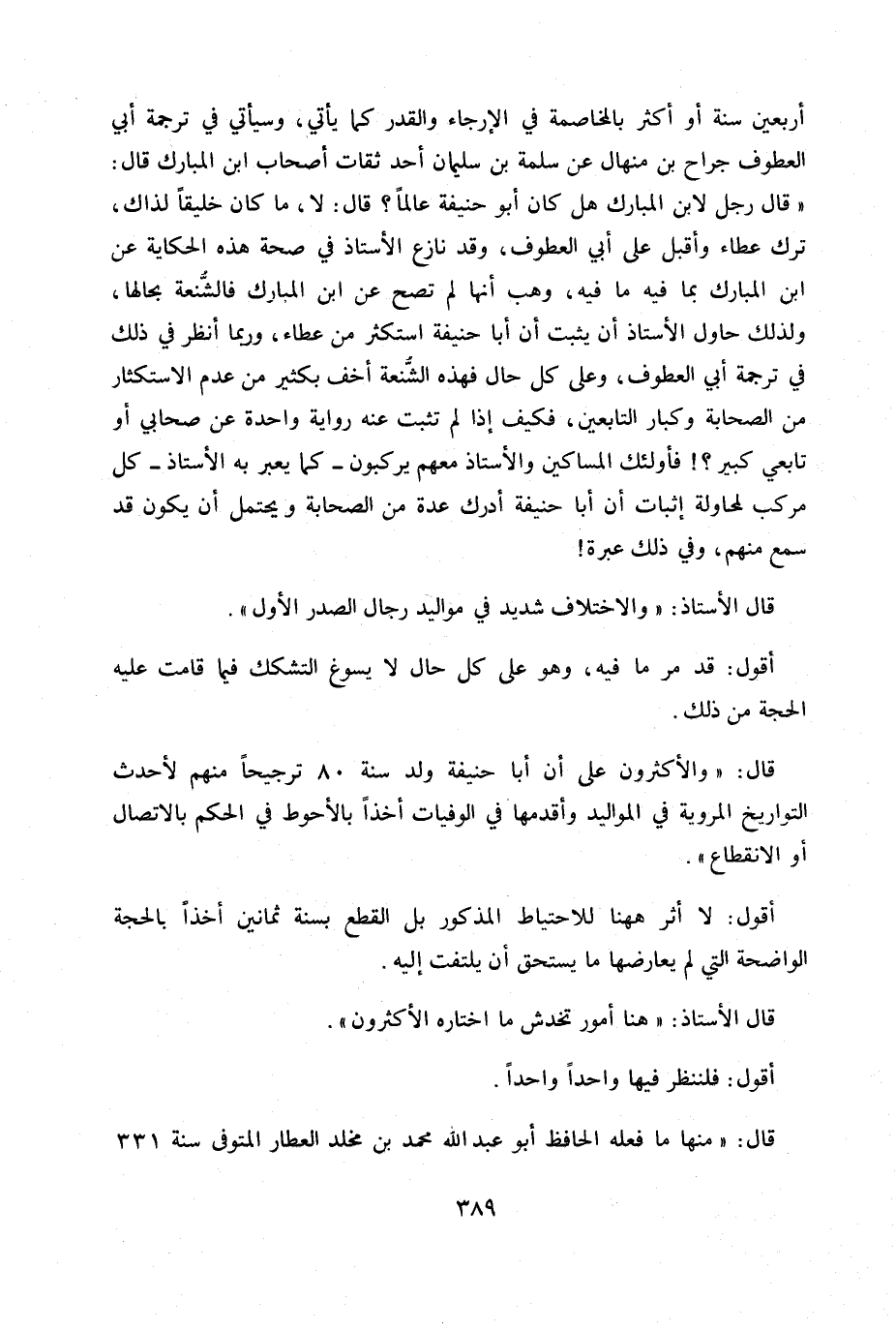 قال: «والأكثرون على أن أبا حنيفة ولد سنة 80 ترجيحا منهم لأحدث التواريخ المروية في المواليد وأقدمها في الوفيات أخذاً بالأحوط في الحكم بالاتصال أو الانقطاع» .