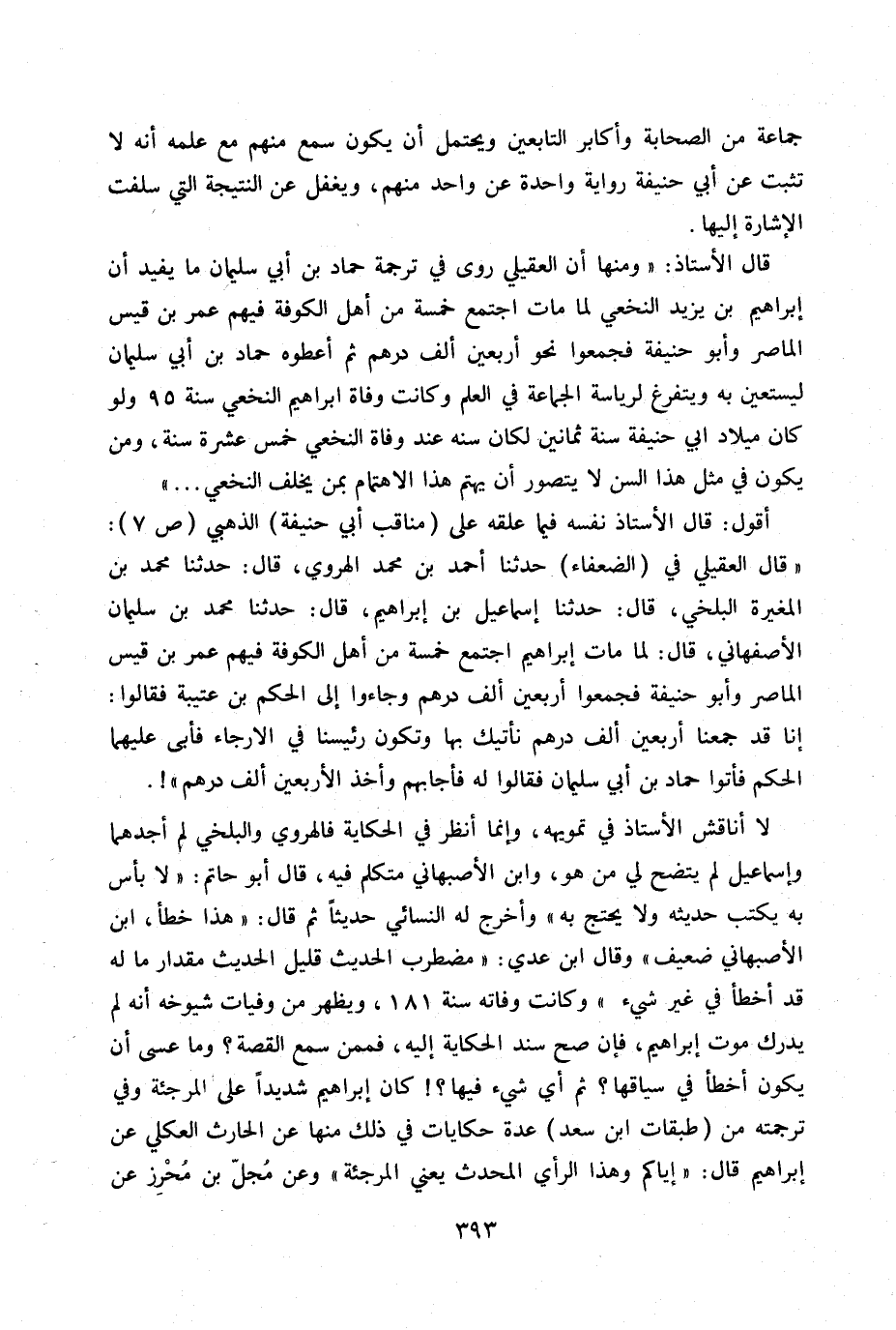 قال الأستاذ: «ومنها أن العقيلي روى في ترجمة حماد بن أبي سليمان ما يفيد أن إبراهيم بن يزيد النخعي لما مات اجتمع خمسة من أهل الكوفة فيهم عمر بن قيس الماصر وأبو حنيفة فجمعوا نحو أربعين آلف درهم ثم أعطوه حماد بن أبي سليمات ليستعين به ويتفرغ لرياسة الجماعة في العلم وكانت وفاة إبراهيم النخعي سنة 95 ولو كان ميلاد أبي حنيفة سنة ثمانين لكان سنة عند وفاة النخعي خمس عشرة سنة، ومن يكون في مثل السن لا يتصور أن يهتم هذا الاهتمام بمن يخلف النخعي ... » .