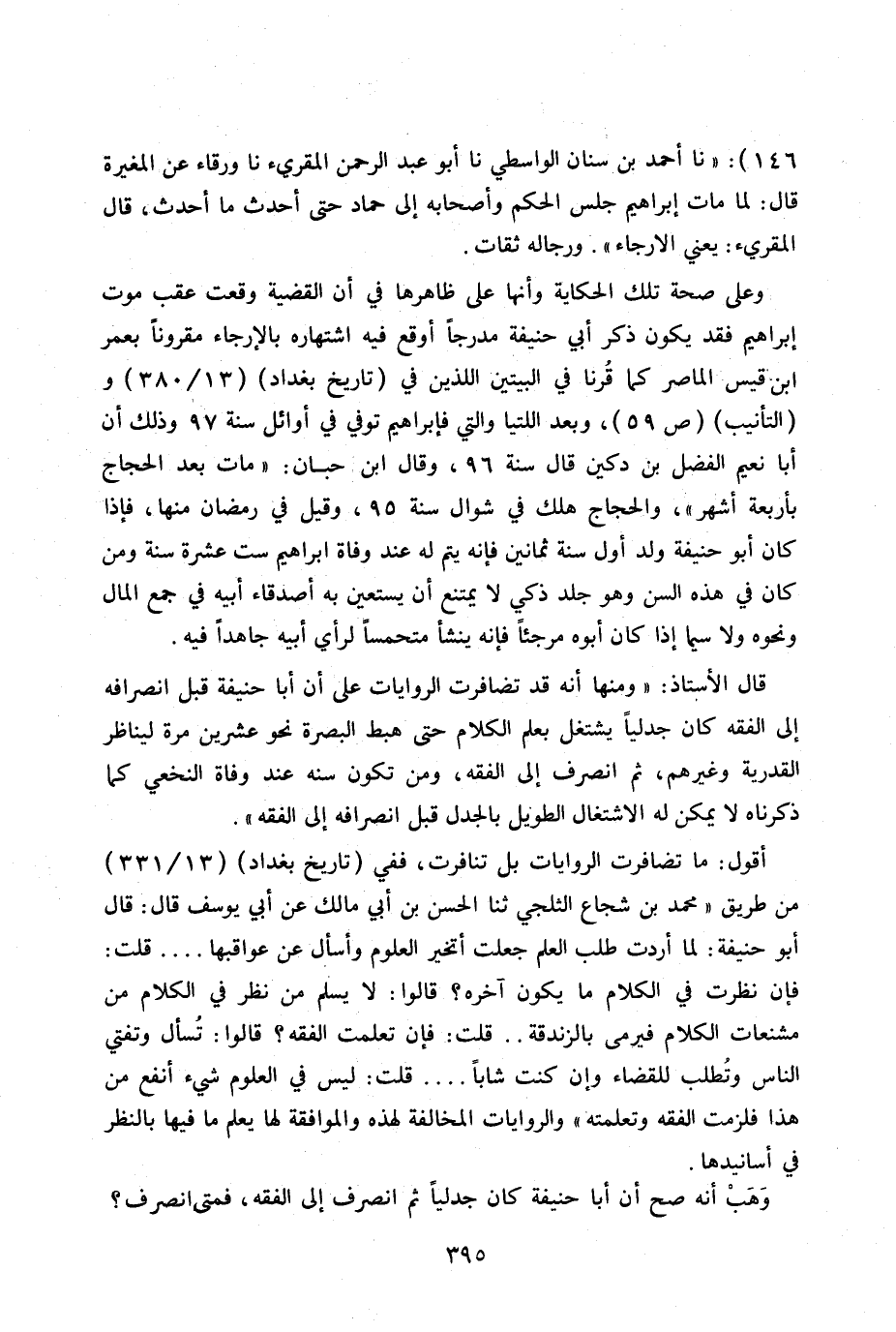 وعلى صحة تلك الحكاية وأنها على ظاهرها في أن القضية وقعت عقب موت إبراهيم فقد يكون ذكر أبي حنيفة مدرجاً أو قع فيه اشتهاره بالأرجاء مقرونة بعمر بن قيس الماصر كم قرناً في البيتين الذين في (تاريخ بغداد) 13 / 380 و (التأنيب) ص 59، وبعد التيار والتي فإبراهيم توفي في أوائل سنة 97 وذلك أن أبا نعيم الفضل بن دكين قال سنة 96، وقال ابن حبان: «مات بعد الحجاج بأربعة أشهر» ، والحجاج هلك في شوال سنة 95، وقيل في رمضان منها، فإذا كان أبو حنيفة ولد أول سنة ثمانين فأنه يتم له عند وفاة إبراهيم ست عشر سنة ومن كان في هذا السن وهو جلد ذكي لا يمتنع أن يستعين به أصدقاء أبيه في جمع المال ونحوه ولا سيما إذا كان أبوه مرجئا فانه ينشا متحمساً لأري أبيه جاهداً فيه.