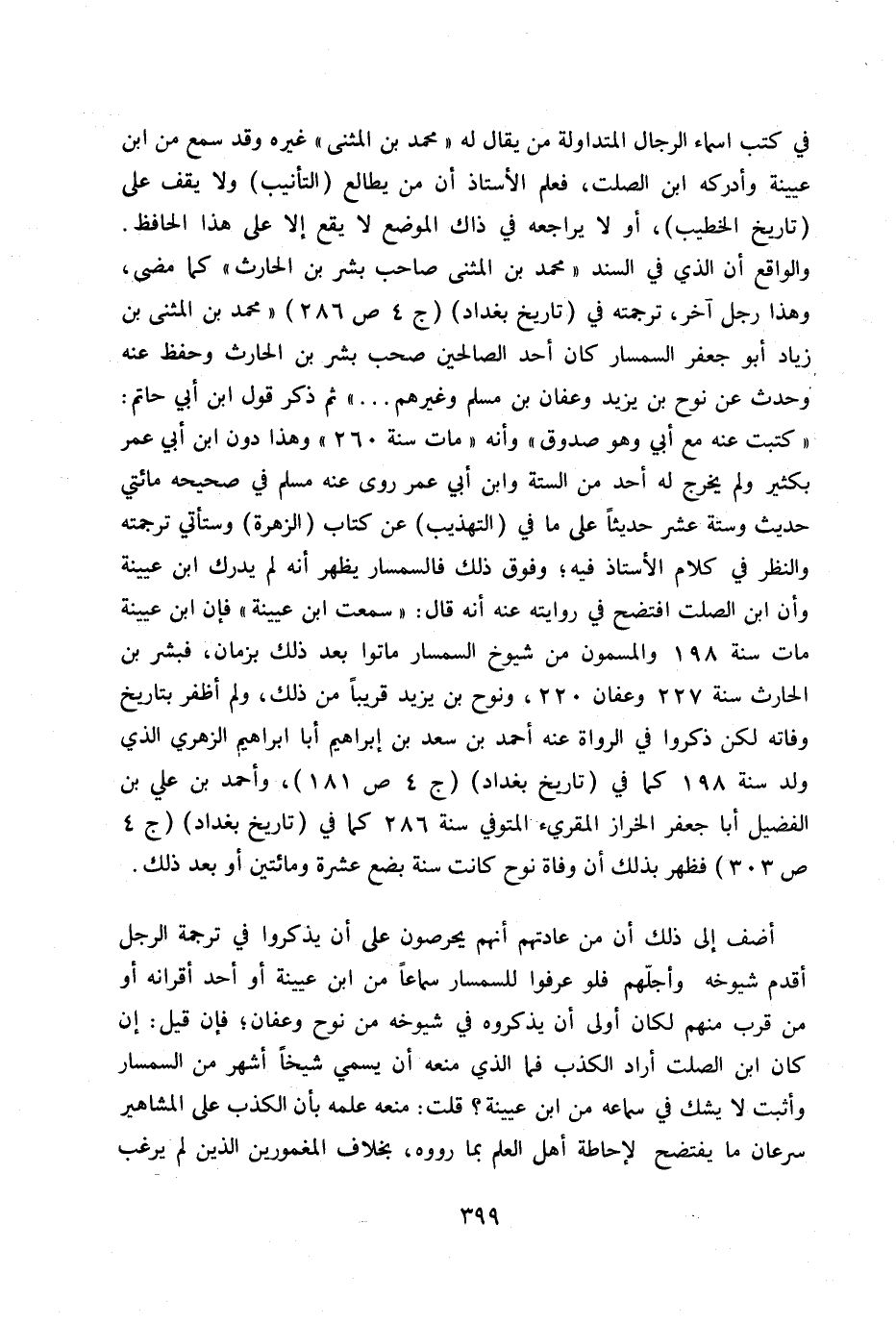 في كتب أسماء الرجال المتداولة من يقال له «محمد بن مثنى» غير وقد سمع من ابن عيينة وأدرك ابن الصلت، فعلم الأستاذ أن من يطالع (التأنيب) ولا يقف على «تاريخ الخطيب) ، أولاً يراجعه في ذاك الموضوع لا يقع إلا على هذا الحافظ. والواقع أن الذي في السند «محمد بن مثنى صاحب بشر بن الحارث» كما مضى، وهذا رجل آخر، ترجمته في «تاريخ بغداد» ج 4 ص 286 «محمد بن المثنى بن زياد أبو جعفر السمسار كان أحد الصالحين صحب بشر بن الحارث وحفظ عنه وحدث عن نوح بن يزيد وعفان بن مسلم وغيرهم ... » ثم ذكر قول ابن أبي حاتم: «كتبة عنه مع أبي وهو صدوق» وأنه «مات سنة 260» وهذا دون ابن أبي عمر بكثير ولم يخرج له أحد من الستة وابن أبي عمر روى عنه مسلم في صحيحه مائتي حديث وستة عشر حديثاً على ما في «التهذيب» عن كتاب «الزهرة» وستأتي ترجمته والنظر في كلام الأستاذ فيه. وفوق ذلك فالسمسار يظهر أنه لم يدرك ابن عيينة وان ابن الصلت افتضح في روايته عنه انه قال «سمعت ابن عيينة» فان ابن عيينة مات سنة 98 والمسلمون من شيوخ السمسار ماتوا بعد ذلك بزمان، فبشر ابن الحارث سنة 227 وعفان 220، ونوح بن يزيد قريباً من ذلك، ولم اظفر بتاريخ وفاته ولكن ذكروا في الرواة عن أحمد بن سعد بن إبراهيم أبا إبراهيم الزهري الذي ولد سنة 198 كما في «تاريخ بغداد» ج 4 ص 181، وأحمد بن علي بن الفضيل أبا جعفر الخراز المقرئ المتوفى سنة 286 كما في «تاريخ بغداد» ج4 ص303 فظهر بذلك أن وفاة كانت سنة بضع عشرة ومائتين أو بعد ذلك. أضف إلى ذلك آن من عادتهم أنهم يحرصون على أن يذكروا في ترجمة الرجل أقدم شيوخه واجلهم فلو عرف لسمسار سماعاً من ابن عيينة أو أحد أقرانه أو من قرب منه لكن أولى أن يذكروه في شيوخه من نوح وعثمان.