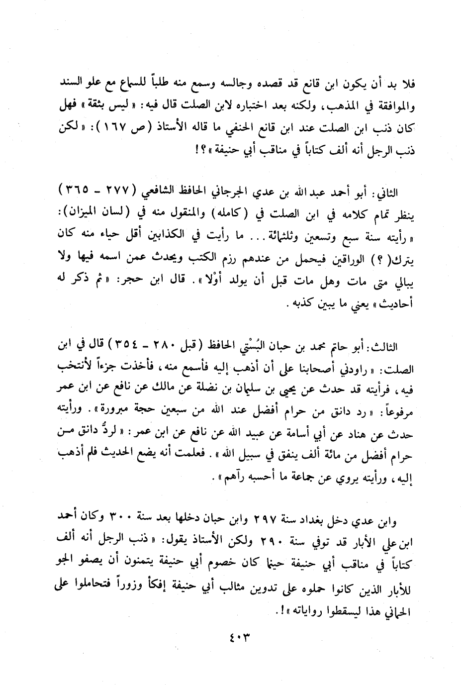 فلا بد أن يكون ابن قانع قد قصده وجالسه وسمع منه طلبا للسماع مع علو السند والموافقة في المذهب، ولكنه بعد اختباره لابن الصلت قال فيه: «ليس بثقة» فهل كان ذنب ابن الصلت عند ابن قانع الحنفي ما قاله الأستاذ ص 167: «لكن ذنب الرجل أنه ألف كتابا في مناقب أبي حنيفة» ؟!