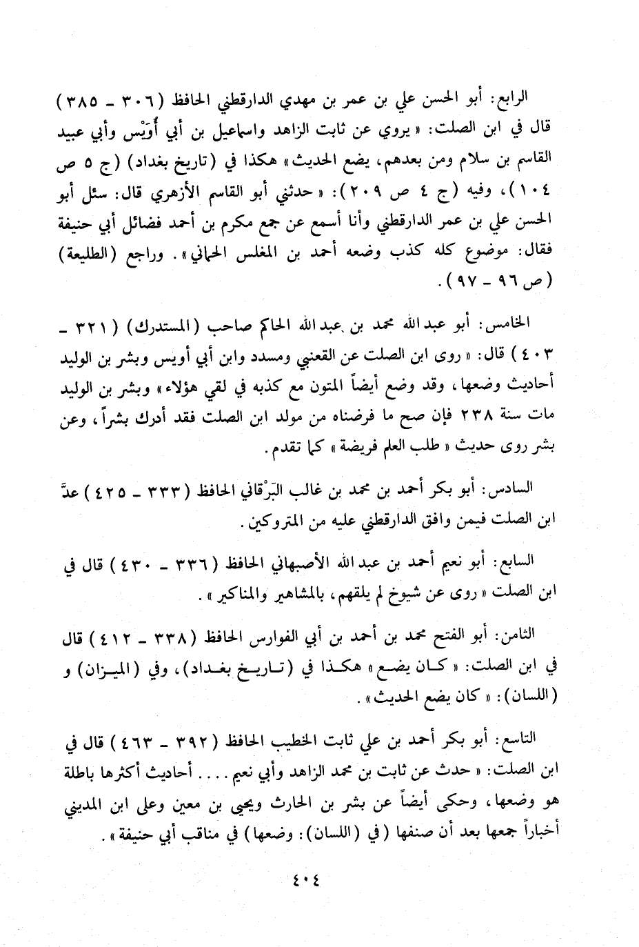 الرابع: أبو الحسن علي بن عمر بن مهدي الدارقطني الحافظ (306 - 385) قال في ابن الصلت: «يروي عن ثابت الزاهد وإسماعيل بن أبي أويس وأبي عبيد القاسم بن سلام ومن بعدهم، يضع الحديث» هكذا في (تاريخ بغداد) (ج 5 ص 104) وفيه (ج4 ص 209) «حدثني أبو القاسم الزهري قال: سئل أبو الحسن علي بن عمر الدارقطني وأنا اسمع عن جمع مكرم بن أحمد فضائل أبي حنيفة فقال: موضوع كله كذب وضعه أحمد ابن المغلس الحماني» .