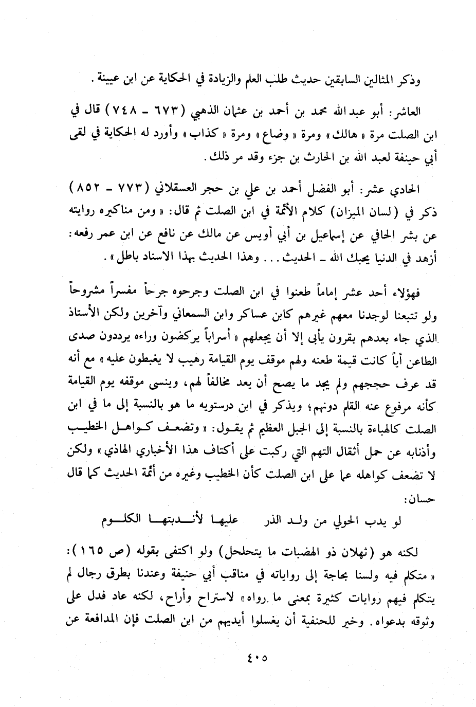لكنه هو (ثهلان ذو الهضبات ما يتحلحل) ولو اكتفى بقوله ص 165 «متكلم فيه ولسنا بحاجة إلى رواياته في مناقب أبي حنيفة وعندنا بطرق رجال لم يتكلم فيهم روايات كثيرة بمعنى ما رواه» لاستراح وأراح، لكنه عاد فدل على وثوقه بدعواه. وخير للحنفية أن يغسلوا أيديهم من ابن الصلت فإن المدافعة عن