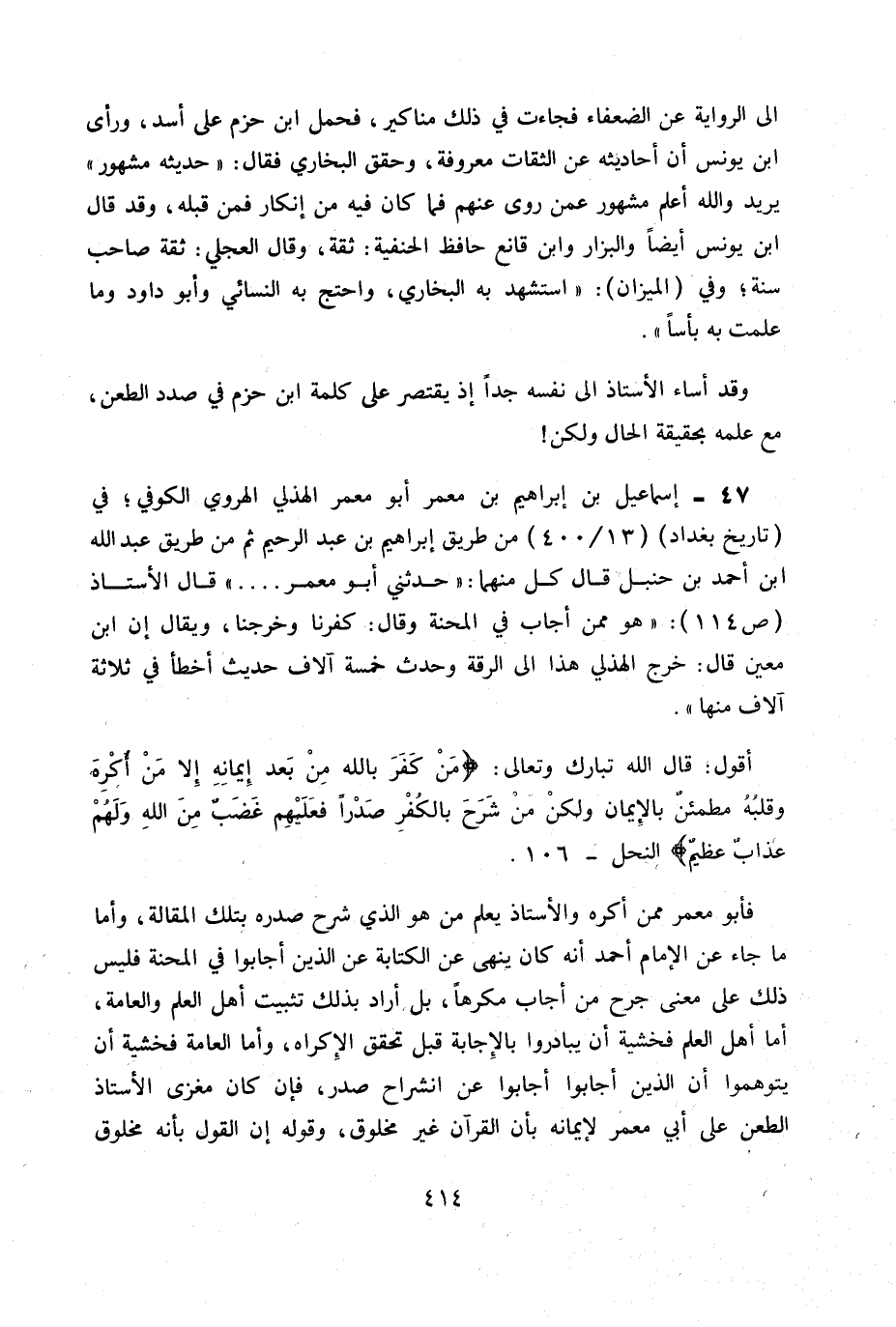 أقول: قال الله تبارك وتعالى: {مَنْ كَفَرَ بِاللهِ مِنْ بَعْدِ إِيمَانِهِ إِلا مَنْ أُكْرِهَ وَقَلْبُهُ مُطْمَئِنٌّ بِالأِيمَانِ وَلَكِنْ مَنْ شَرَحَ بِالْكُفْرِ صَدْراً فَعَلَيْهِمْ غَضَبٌ مِنَ اللهِ وَلَهُمْ عَذَابٌ عَظِيمٌ} فأبو معمر ممن أكره والأستاذ يعلم من هو الذي شرح صدره بتلك المقالة. وأما ما جاء عن الإمام أحمد أنه كان ينهى عن الكتابة عن الذين أجابوا في المحنة فليس ذلك على معنى جرح من أجاب مكرها، بل أراد بذلك تثبيت أهل العلم والعامة، أما أهل العلم فخشية أن يبادروا بالإجابة قبل تحقق الإكراه، وأما العامة فخشية أن يتوهموا أن الذين أجابوا أجابوا عن الشراح صدر، فإن كان مغزى الأستاذ الطعن على أبي معمر لإيمانه بأن القرآن غير مخلوق، وقوله إن القول بأنه مخلوق