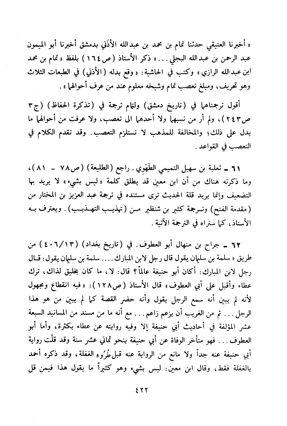 61- ثعلبة بن سهيل التميمي الطهوي. راجع (الطليعة) ص 78 - 81، وما ذكرته هناك من أن ابن معين قد يطلق كلمة «ليس بشيء» لا يريد بها التضعيف وإنما يريد قلة الحديث ترى مستنده في ترجمة عبد العزيز بن المختار من (مقدمة الفتح) وترجمة كثير بن شنظير من (تهذيب التهذيب) ويعترف به الأستاذ كما ستراه في الترجمة الآتية.