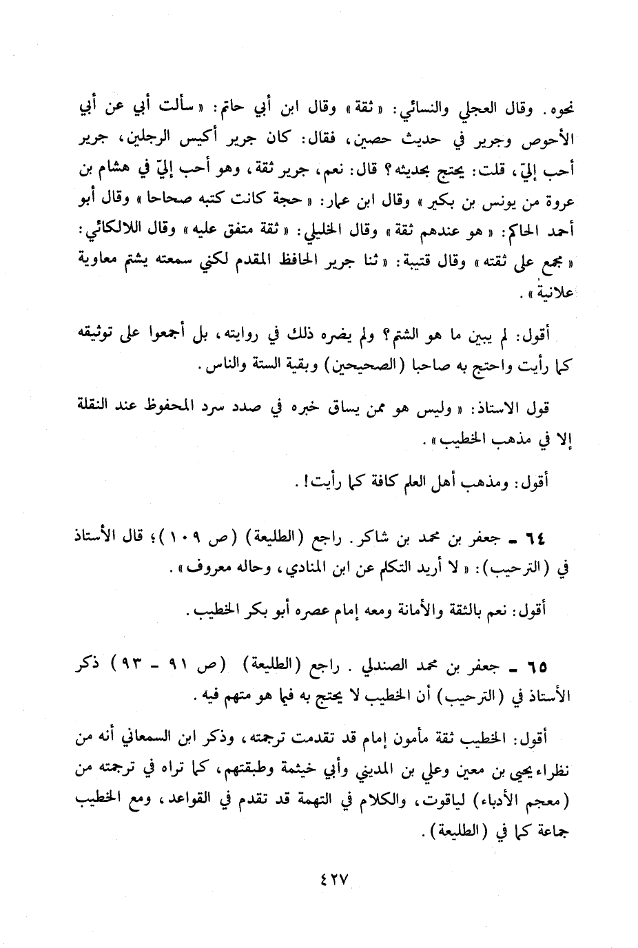 نحوه. وقال العجلي والنسائي «ثقة» وقال ابن أبي حاتم «سألت أبي عن أبي الأحوص وجرير في حديث حصين، فقال: كان جريراً أكيس الرجلين، وجرير أحب إلي، قلت: يحتج بحديثه؟ قال: نعم، جرير ثقة، وهو أحب إلي في هشام بن عروة من يونس بن بكير» وقال ابن عمار «حجة كانت كتبه صحاحاً» وقال أبو أحمد الحاكم «هو عندهم ثقة» وقال الخليلي «ثقة متفق عليه» وقال اللالكائي «مجمع على ثقته» وقال قتيبة «ثنا جرير الحافظ المقدم لكني سمعته يشتم معاوية علانية» .