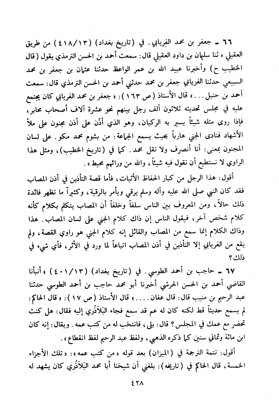 66- جعفر بن محمد الفريابي. في «تاريخ بغداد» «13 / 418» من طريق العقيلي «ثنا سليمان بن داود العقيلي قال: سمعت أحمد بن الحسن الترمذي يقول «قال الخطيب ح» وأخبرنا عبيد الله بن عمر الواعظ حدثنا عثمان بن جعفر بن محمد السبيعي حدثنا الفريابي جعفر بن محمد حدثني أحمد بن الحسن والترمذي قال سمعت أحمد ابن حنبل ... » قال الأستاذ ص 163 «جعفر بن محمد الفريابي كان يجتمع عليه في مجلس تحديثه ثلاثون ألف رجل بينهم نحو عشرة آلاف أصحاب محابر، فعدلا روى مثله شيئاً يسير به الركبان، وهو الذي آذن على أذن مجنون على مل الأشهاد فنادى الجني هارباً بحيث يسمع الجماعة: من بشوم محمد مكو. على لسان المجنون بمعنى: أنا أنصرف ولا تقل محمد. كما في «تاريخ الخطيب» ، ومثل هذا الراوي لا نستطيع أن نقول فيه شيء، والله من وراءهم محيط» .
