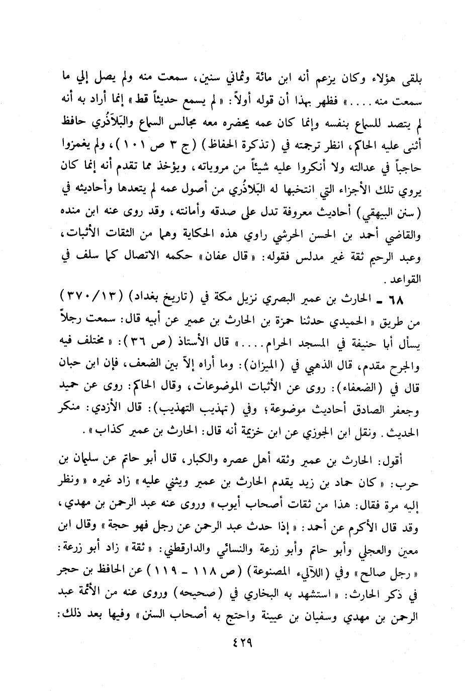 68- الحارث بن عمير البصري نزيل مكة في «تاريخ بغداد» «13/ 370» من طريق «الحميدي حدثنا حمزة بن الحارث عن عمير عن أبيه قال سمعت رجل يسأل أبا حنفية في المسجد الحرام ... » قال الأستاذ ص 36 «مختلف فيه والجرح مقدم، قال الذهبي «الميزان» : وما أراه إلا بين الضعف، فإن ابن حبان قال في «الضعفاء» : روى عن الإثبات والموضوعات. وقال الحاكم: روى عن حميد وجعفر الصادق أحاديث موضوعة. وفي «تهذيب التهذيب» : قال الأزدي: منكر الحديث. ونقل ابن الجوزي عن ابن خزيمة أنه قال: الحارث بن عمير كذاب» .