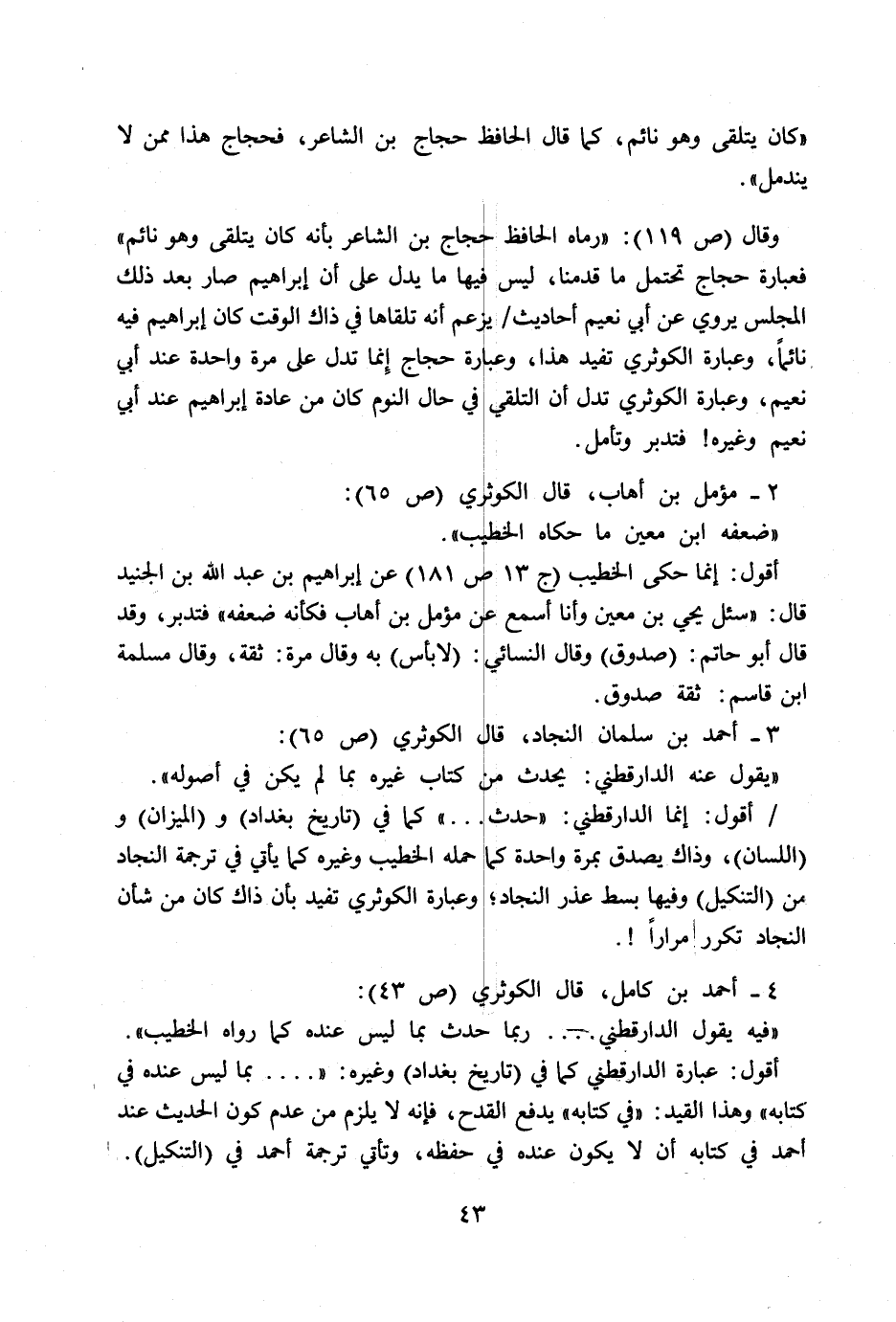 وقال ص 119: «رماه الحافظ حجاج بن الشاعر بأنه كان يتلقى وهو نائم» فعبارة حجاج تحتمل ما قدمنا، ليس فيها ما يدل على أن إبراهيم صار بعد ذلك المجلس يروي عن أبي نعيم أحاديث / يزعم أنه تلقاها في ذاك الوقت الذي كان إبراهيم فيه نائماً. وعبارة الكوثري تفيد هذا، وعبارة حجاج إنما تدل على مرة واحدة عند أبي نعيم، وعبارة الكوثري تدل أن التلقي في حال النوم كان من عادة إبراهيم عند أبي نعيم وغيره! فتدبر وتأمل.