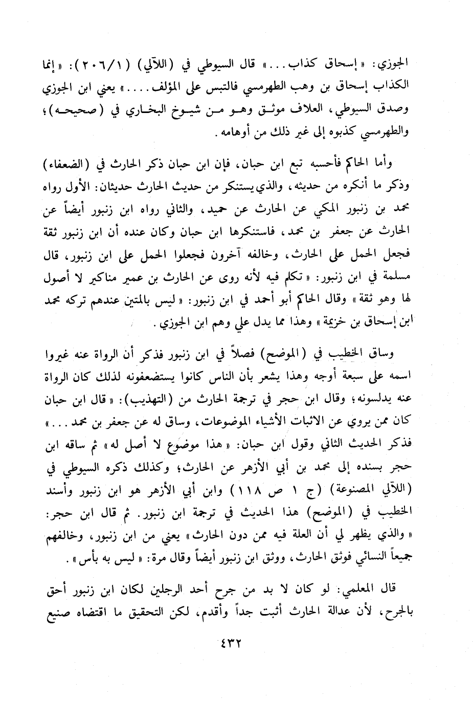 وساق الخطيب في (الموضح) فصلاً في ابن زنبور فذكر أن الرواة عنه غيروا اسمه على سبعة أوجه وهذا يشعر بان الناس كانوا يستضعفونه لذلك كان الرواة عنه يدلسونه. وقال ابن حجر في ترجمة الحارث من (التهذيب) : «قال ابن حبان كان ممن يروي عن الإثبات الأشياء الموضوعات لا أصل له» ثم ساقه ابن حجر بسنده إلى محمد بن أبي الأزهر عن الحارث. وكذلك ذكره السيوطي في (اللآلي المصنوعة) ج1 ص118 وابن الأزهر هو ابن زنبور وأسند الخطيب في (الموضح) هذا الحديث في ترجمة ابن زنبور. ثم قال ابن حجر: «والذي يظهر لي أن العلة فيه ممن دون الحارث» يعني من ابن زنبور، وخالفهم جميعاً النسائي فوثق الحارث، ووثق ابن زنبور أيضاً وقال مرة: «ليس به بأس» .