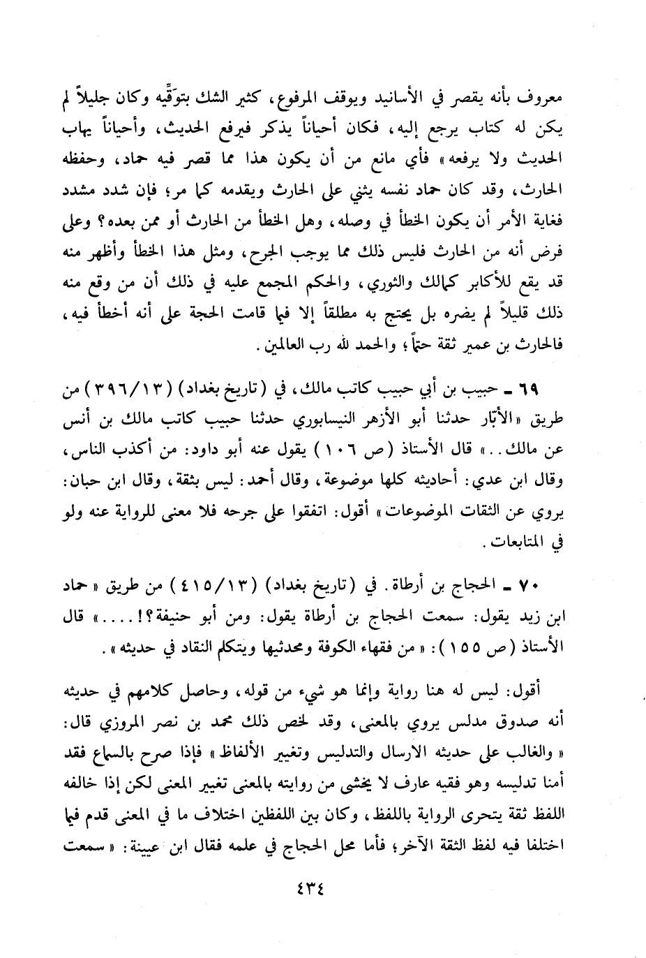 70- الحجاج بن أرطاة. في (تاريخ بغداد) 13 / 415 من طريق «حماد بن زيد يقول: سمعت الحجاج بن أرطاة يقول: من أبو حنيفة؟! ... » قال الأستاذ ص155: «من فقهاء الكوفة ومحدثيها ويتكلم النقاد في حديثه» .