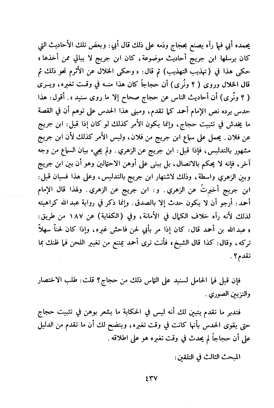 يحمده أبي فيما رآه يصنع بحجاج وذمة على ذلك قال أبي: وبعض تلك الأحاديث التي كان يرسلها ابن جرير أحاديث موضوعة، كان ابن جريج لا يبالي ممن آخذها» حكى هذا في (تهذيب التهذيب) ثم قال «وحكى الخلال عن الأثرم نحو ذلك ثم قال الخلال وروى (؟ ونرى) أن حجاجاً كان هذا منه في وقت تغيره، ويرى (؟ ونرى) أن أحاديث الناس عن حجاج صحاح إلا ما روى سنيد» . أقول: هذا حدس يرده نص الإمام أحمد كما تقدم، ومبنى هذا الحدس على توهم أن القصة ما يخدش في تثبيت حجاج، وإنما يكون الأمر كذلك لو كان إذا قيل: ابن جريج عن فلان. يحمل عللا سماع ابن جريج من فلان، وليس الأمر كذلك لأن ابن جريج مشهور بالتدليس، فإذا قيل: ابن جريج عن الزهري. ولم يجيء بيان السماع من وجه آخر، فأنه لا يحكم بالاتصال، بل يبنى على أو هن الاحتمالين وهو أن بين ابن جريج وبين الزهري واسطة، وذلك لاشتهار ابن جريج بالتدليس، وعلى هذا فسيان قيل: ابن جريج أخبرت عن الزهري. و: ابن جريج عن الزهري. ولهذا قال الإمام أحمد: أرجو أن لا يكون حدث إلا بالصدق. وإنما ذكر في رواية عبد الله كراهيته لذلك لأنه رآه خلاف الكمال في الأمانة. وفي (الكفاية) ص187 من طريق «عبد الله بن أحمد قال: كان إذا مر بأبي لحن فاحش غيره، وإذا كان لحناً سهلاً تركه، وقال: كذا قال الشيخ» فأنت ترى أحمد يمتنع من تغيير اللحن فما ظنك بما يقدم؟.