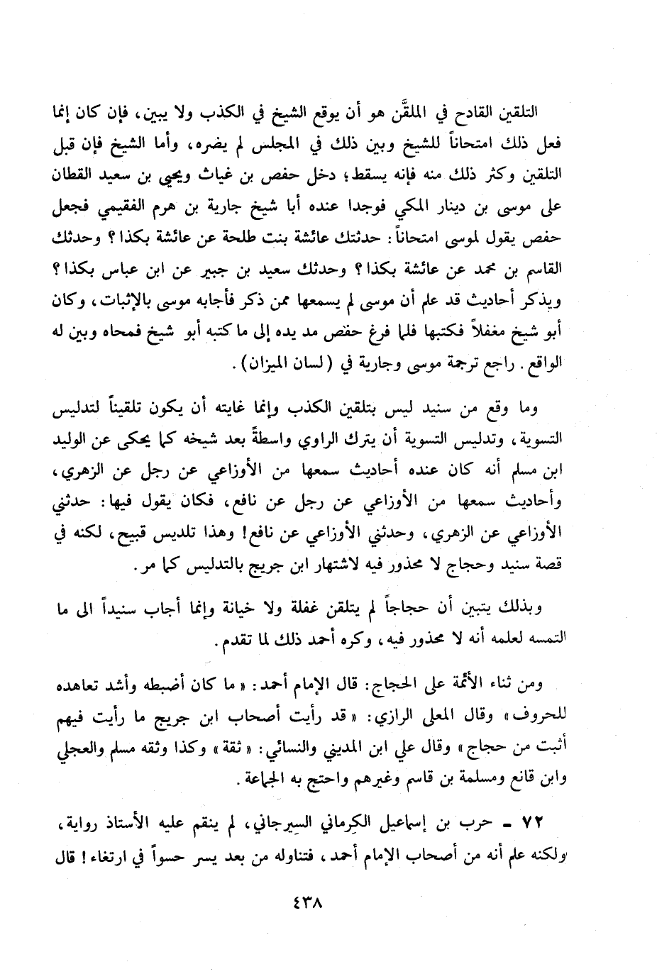 وما وقع من سنيد ليس بتلقين الكذب وإنما غايته أن يكون تلقيناً لتدليس التسوية، وتدليس التسوية أن يترك الراوي واسطة بعد شيخه كما يحكى عن الوليد بن مسلم أنه كان عنده أحاديث سمعها من الأوزاعي عن رجل عن الزهري، وأحاديث سمعها من الأوزاعي عن رجل عن نافع، فكان يقول فيها: حدثني الأوزاعي عن الزهري، وحدثني الأوزاعي عن نافع! وهذا تدليس قبيح، لكنه في قصة سنيد وحجاج لا محذور فيه لاشتهار ابن جريج بالتدليس كما مر.