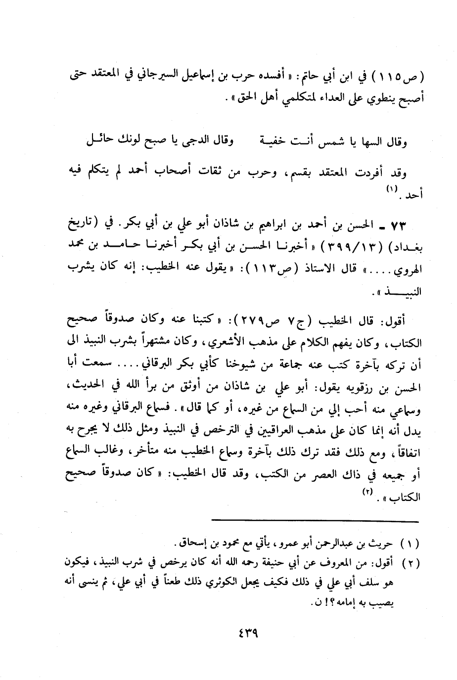 ص 115 في ابن أبي حاتم «أفسده حرب بن إسماعيل السيرجاني في المعتقد حتى أصبح ينطوي على العداء لمتكلمي أهل الحق» .