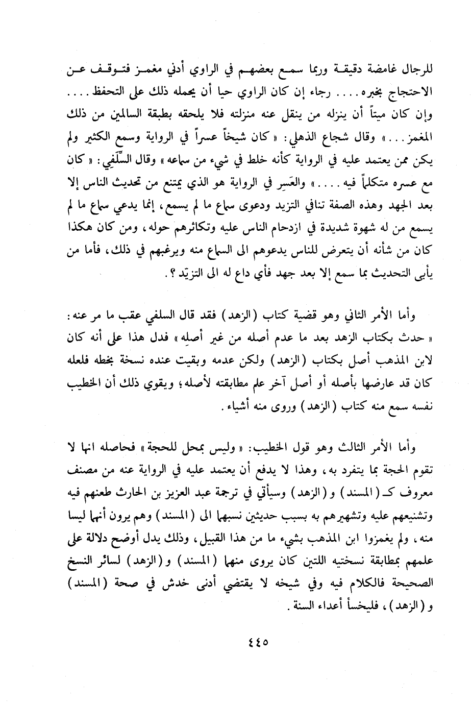وأما الأمر الثالث وهو قول الخطيب «وليس بمحل للحجة» فحاصله أنها لا تقوم الحجة بما يتفرد به، وهذا لا يدفع أن يعتمد عليه في الرواية عنه من مصنف معروف: (المسند) و (الزهد) وسيأتي في ترجمة عبد العزيز بن الحارث طعنهم فيه وتشنيعهم عليه وتشهيرهم به بسبب حديثين نسبهما إلى (المسند) وهم يرون أنهما ليسا منه، ولم يغمزوا ابن المذهب بشيء ما من هذا القبيل، وذلك يدل أوضح دلالة على علمهم بمطابقة نسختيه اللتين كان يروي منهما (المسند) و (الزهد) لسائر النسخ الصحيحة فالكلام فيه وفي شيخه لا يقتضي أدنى خدش في صحة (المسند) و (الزهد) ، فليخسأ أعداء السنة.