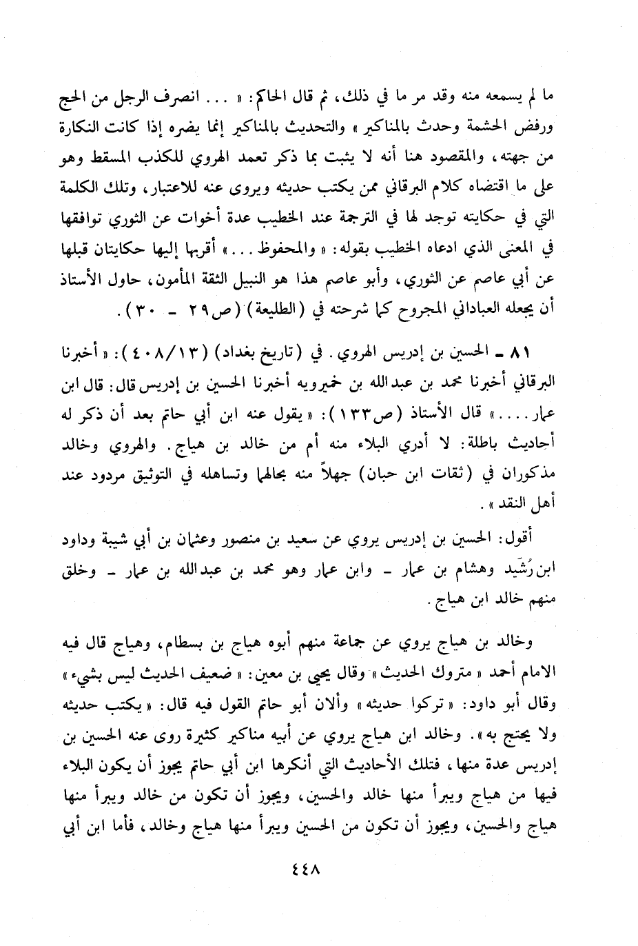 81- الحسين بن إدريس الهروي. في (تاريخ بغداد) 13/408: «أخبرنا البرقاني أخبرنا محمد بن عبد الله بن خميرويه أخبرنا الحسين بن إدريس قال: قال ابن عمار ... » قال الأستاذ ص 133 «يقول عنه ابن أبي حاتم بعد أن ذكر له أحاديث باطلة: لا أدري البلاء منه أم من خالد بن هياج. والهروي وخالد مذكوران في (ثقات ابن حبان) جهلاً منه بحالههما وتساهله في التوثيق مردود عند أهل النقد» .
