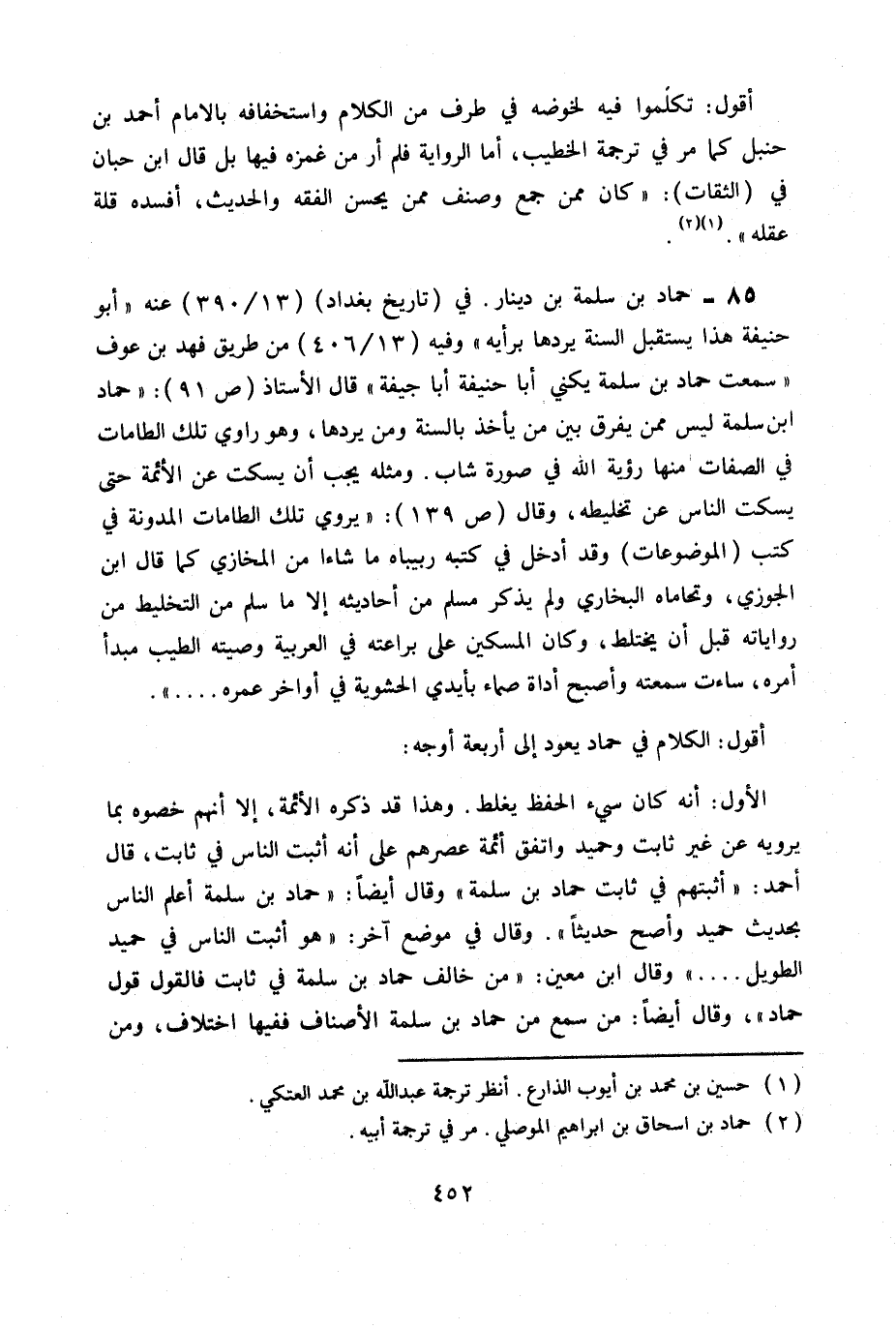 85- حماد بن سلمة بن دينار. في (تاريخ بغداد) (13/390) عنه «أبو حنيفة هذا يستقبل السنة يردها برأيه» وفيه (13/406) من طريق فهد بن عوف «سمعت حماد بن سلمه يكني أبا حنيفة أبا جيفة» قال الأستاذ ص 91 «حماد بن سلمة ليس ممن يفرق بين من يأخذ بالسنة ومن يردها، وهو راوي تلك الطامات في الصفات منها رؤية الله في صورة شاب ومثله يجب أن يسكت عن الأئمة حتى يسكت الناس عن تخليطه، وقال ص 139 «يروي تلك الطامات المدونة في كتب (الموضوعات) وقد أدخل في كتبه ربيباه ما شاء من المخازي كما قال ابن الجوزي، وتحاماه البخاري ولم يذكر مسلم من أحاديثه إلا ما سلم من التخليط من رواياته قبل أن يختلط، وكان المسكين على براعته في العربية وصيته الطيب مبدأ أمره، ساءت سمعته وأصبح أداة صماء بأيدي الحشوية في أواخر عمره ... »