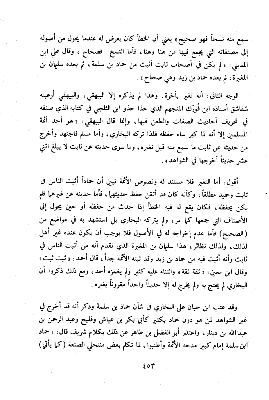 أقول: أما التغير فلا مستند له ونصوص الأئمة تبين أن حماداً أثبت الناس في ثابت وحميد مطلقاً، وكأنه كان قد أتقن حفظ حديثهما، فأما حديثه عن غيرهما فلم يكن يحفظه، فكان يقع له فيه الخطأ إذا حدث من حفظه أو حين يحول إلى الأصناف التي جملها كما مر. ولم يتركه البخاري بل استشهد به في المواضع من (الصحيح) فأما عدم إخراجه له في الأصول فلا يوجب أن يكون عنده غير أهل لذلك، ولذلك نظائر، هذا سليمان بن المغيرة الذي تقدم أنه من أثبت الناس في ثابت وأنه أثبت فيه من حماد بن زيد وقد ثبته الأئمة جداً، قال أحمد: «ثبت ثبت» وقال ابن معين «ثقة ثقة» والثناء عليه كثير ولم يغمزه أحد، ومع ذلك ذكروا أن البخاري لم يحتج به ولم يخرج له إلا حديثاً واحداً مقرونا بغيره. وقد عتب ابن حبان على البخاري في شأن حماد بن سلمة وذكر أنه قد أخرج في غير الشواهد لمن هو دون حماد بكثير كأبي بكر بن عياش وفليح وعبد الرحمن بن عبد الله بن دينار. واعتذر أبو الفضل بن طاهر عن ذلك بكلام شريف قال: «حماد بن سلمة إمام كبير مدحه الأئمة وأطنبوا، لما تكلم بعض منتحلي الصنعة (كما يأتي)