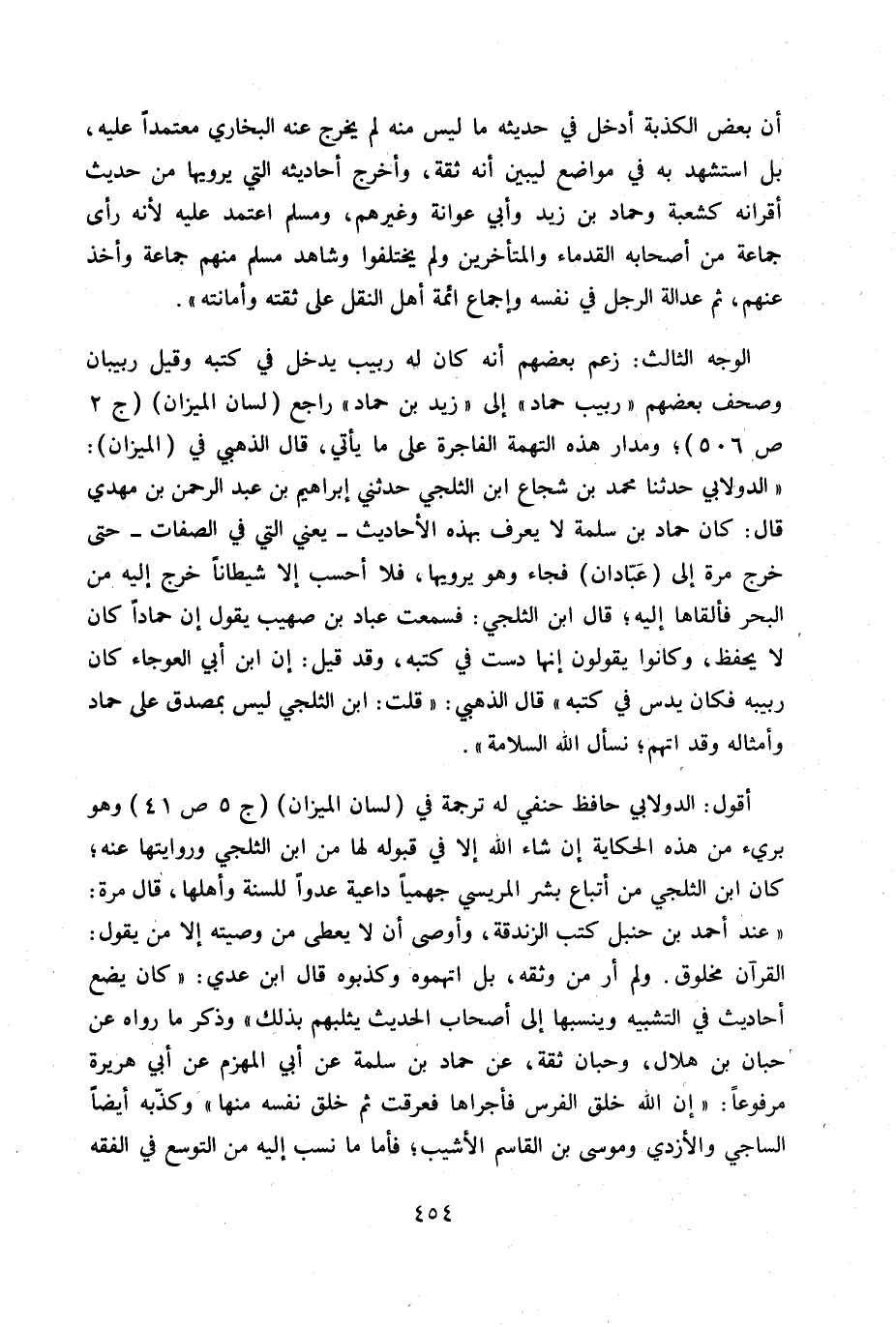 الوجه الثالث: زعم بعضهم انه كان له ربيب يدخل في كتبه وقيل ربيبان وصحف بعضهم «ربيب حماد» إلى «زيد بن حماد» راجع (لسان الميزان) ج 2 ص 506. ومدار هذه التهمة الفاجرة على ما يأتي، وقال الذهبي في (الميزان) : «الدولابي حدثنا محمد بن شجاع ابن الثلجي حدثني إبراهيم بن عبد الرحمن بن مهدي قال: كان حماد بن سلمة لا يعرف بهذه الأحاديث - يعني التي في الصفات - حتى خرج مرة إلى (عبادان) فجاء وهو يرويها، فلا أحسب إلا شيطاناً خرج إليه من البحر فألقاها إليه. قال ابن الثلجي: فسمعت عباد بن صهيب يقول إن حماداً كان لا يحفظ، وكانوا يقولون إنها دست في كتبه، وقد قيل: إن ابن أبي العوجاء كان ربيبه فكان يدس في كتبه» قال الذهبي: «قلت: ابن الثلجي ليس بمصدق على حماد وأمثاله وقد اتهم. نسأل الله السلامة» .