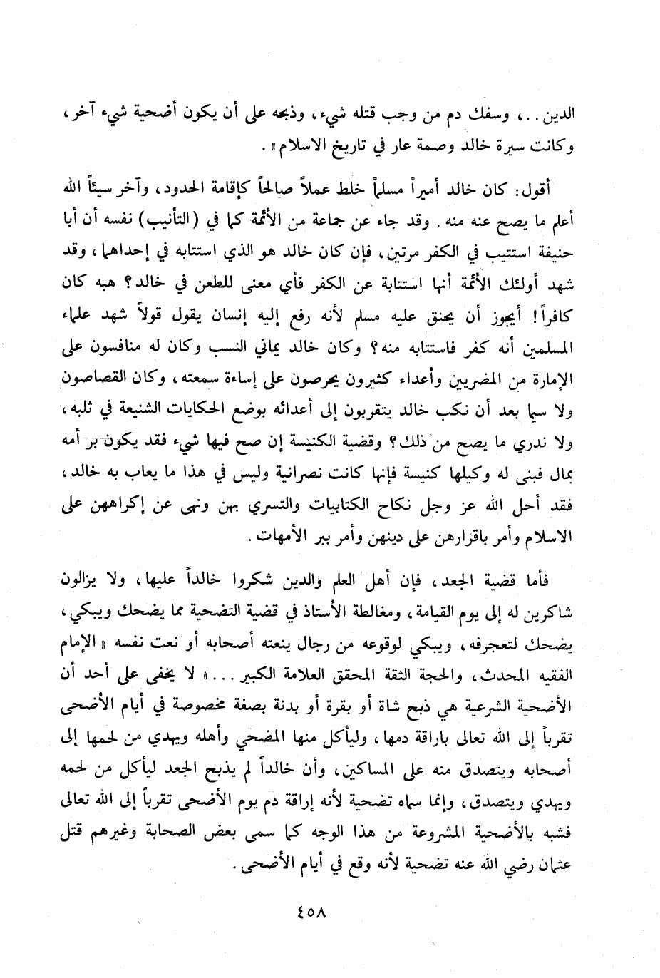 أقول: كان خالد أميرا مسلما خلط عملا صالحا كإقامة الحدود وآخر سيئا الله أعلم ما يصح عنه منه. وقد جاء عن جماعة من الأئمة كما في (التأنيب) نفسه أن أبا حنيفة استتيب في الكفر مرتين فإن كان خالد هو الذي استتابه في أحدهما وقد شهد أولئك الأئمة أنها استتابة عن الكفر فأي معنى للطعن في خالد؟ هبه كان كافرا! أيجوز أن يحنق عليه مسلم لأنه رفع إليه إنسان يقول قولا شهد علماء المسلمين أنه كفر فاستتابه منه؟ وكان خالد يماني النسب وكان له منافسون على الإمارة من المضريين وأعداء كثيرون يحرصون على إساءة سمعته، وكان القصاصون ولا سيما بعد أن نكب خالد يتقربون إلى أعدائه بوضع الحكايات الشنيعة في ثلبه ولا ندري ما يصح من ذلك؟ وقضية الكنيسة إن صح فيها شيء فقد يكون بر أمه بمال فبنى لها وكيلها كنيسة فإنها كانت نصرانية وليس في هذا ما يعاب به خالد فقد أحل الله عز وجل نكاح الكتابيات والتسري بهن ونهى عن إكراههن على الإسلام وأمر بإقرارهن على دينهن وأمر ببر الأمهات. فأما قضية الجعد فإن أهل العلم والدين شكروا خالد عليها ولا يزالون شاكرين له إلى يوم القيامة ومغالطة الأستاذ في قضية التضحية مما يضحك ويبكي يضحك لتعجرفه ويبكي لوقوعه من رجل ينعته أصحابه أو ينعت نفسه «الإمام الفقيه المحدث والحجة الثقة المحقق العلامة الكبير ... » لا يخفي على أحد أن الضحية الشرعية هي ذبح شاه أو بقرة أو بدنة بصفة مخصوصة في أيام الأضحى تقربا إلى الله تعالى بإراقة دمها، وليأكل منها المضحي وأهله ويهدي من لحمها إلى أصحابه ويتصدق على المساكين، وأن خالداً لم يذبح الجعد ليأكل من لحمه ويهدي ويتصدق، وإنما سماه تضحية لأنه إراقة دم يوم الضحى تقرباً إلى الله تعالى فشبهه بالضحية المشروعة من هذا الوجه كما سمى بعض الصحابة وغيرهم قتل عثمان رضي الله عنه تضحية لأنه وقع في أيام الضحى.