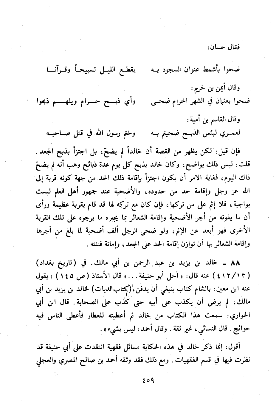 فان قيل: لكن يظهر من القصة أن خالدا لم يضح، بل اجتزأ بذبح الجعد. قلت: ليس ذلك بواضح، وكان خالد يذبح كل يوم عدة ذبائح وهب أنه لم يضح ذاك اليوم، فغاية الأمر أن يكون اجتزأ بإقامة ذلك الحد من جهة كونه قربه إلى الله عز وجل وإقامة حد من حدود، والضحية عند جمهور أهل العلم ليست بواجبه، فلا إثم على من تركها، فإن كان مع تركه لها قد قام بقربه عظمية ورأى أن ما يفوته من اجر الضحية وإقامة الشعائر بما يجبره ما يرجوه على تلك القربة الأخرى فهو أبعد عن الإثم، ولو ضحى الرجل ألف أضحية لما بلغ من أجرها وإقامة الشعائر بها أن توازن إقامة الحد على الجعد، وإماتة فتنته.