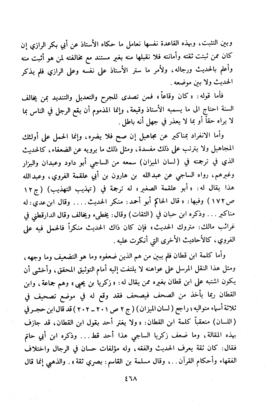 وأما كلمة ابن قطان فلم يبين من هم الذين ضعفوه وماهر التضعيف وما وجهه، ومثل هذا النقل المرسل على عواهنه لا يلتفت إليه أمام التوثيق المحقق، وأخشى أن يكون اشتبه على ابن قطان بغيره ممن يقال له: «زكريا بن يحيى» وهم جماعة، وابن القطان ربما يأخذ من الصحف فيصحف فقد وقع له في موضع تصحيف في ثلاثة أسماء متوالية. راجع (لسان الميزان) ج 2 ص 201- 202 قد قال ابن حجر في (اللسان» متعقباً كلمة ابن القطان «ولا يغتر أحد بقول ابن القطان، وقد جازف بهذه المقالة، وما ضعف زكريا الساجي هذا أحد قط ... وذكره ابن أبي حاتم فقال: كان ثقة يعرف الحديث والفقه، وله مؤلفات حسان في الرجال واختلاف آلفها وأحكام القرآن ... وقال مسلمة بن القاسم: بصري ثقة» . والذهبي إنما قال