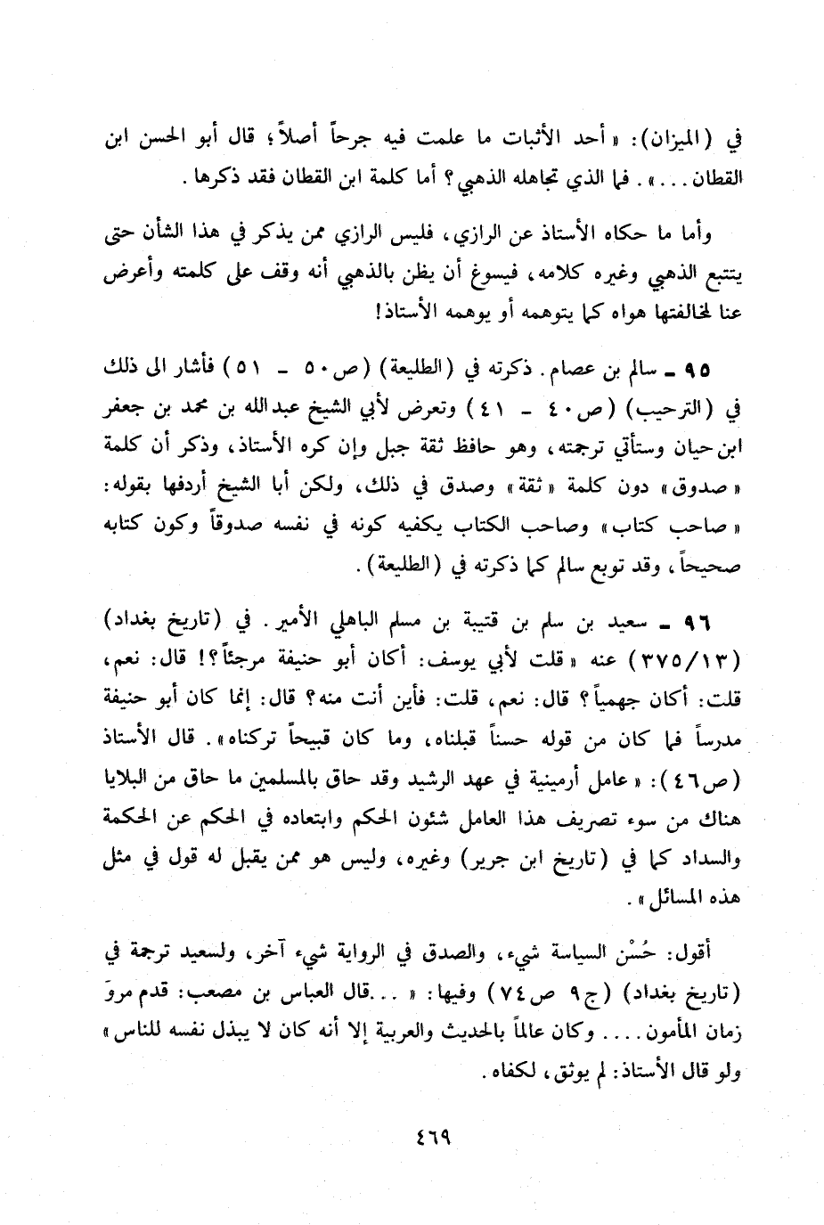 96- سعيد بن مسلم بن قتيبة بن مسلم الباهلي الأمير. في (تاريخ بغداد) 13/375 عنه «قلت لأبي يوسف: أكان أبو حنيفة مرجئاً؟ ! قال: نعم، قلت: أكان جهمياً؟ قال نعم، قلت: فأين أنت منه؟ قال: إنما كان أبو حنيفة مدرساً فما كان من قوله حسناً قبلناه، وما كان قبيحاً تركناه» . قال الأستاذ ص 46 «عامل أرمينية في عهد الرشيد وقد حاق بالمسلمين ما حاق من البلايا هناك من سوء تصريف هذا العامل شيءون الحكم وابتعاده في الحكم عن الحكمة والسداد كما في (تاريخ ابن جرير) وغيره، وليس هو ممن يقبل له قول في مثل هذه المسائل» .