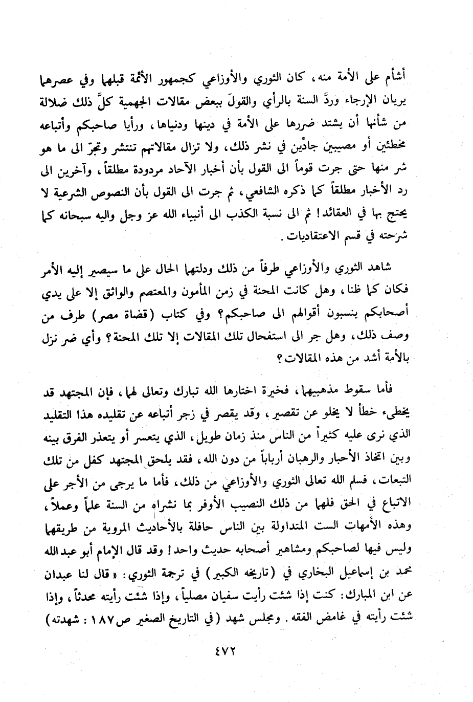 أشأم على الأمة منه. كان الثوري والأوزاعي كجمهور الأئمة قبلها وفي عصرهما يريان الإرجاء ورد السنة بالرأي والقول ببعض مقالات الجهمية كل ذلك ضلالة من شأنها أن يشتد ضررها على الأمة في دينها ودنياها ورأيا صاحبكم وأتباعه مخطئين أو مصيبين جادين في نشر ذلك ولا تزال مقالاتهم تنتشر وتجر إلى ما هو شر منها حتى جرت قوما إلى القول بأن أخبار الآحاد مردودة مطلقا وآخرين إلى رد الأخبار مطلقا كما ذكره الشافعي ثم جرت إلى القول بأن النصوص الشرعية لا يحتج بها في العقائد! ثم إلى نسبه الكذب إلى أنبياء الله عز وجل وإليه سبحانه كما شرحته في قسم الاعتقاديات.