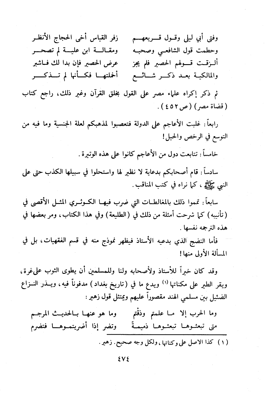 وقد كان خيراً للأستاذ ولأصحابه ولنا وللمسلمين أن يطوى الثوب على غزة ويقر الطير على مكناتها ويدع ما في (تاريخ بغداد) مدفوناً فيه ويذر النزاع الضئيل بين مسلمي الهند مقصورا عليهم ويتمثل قول زهير: