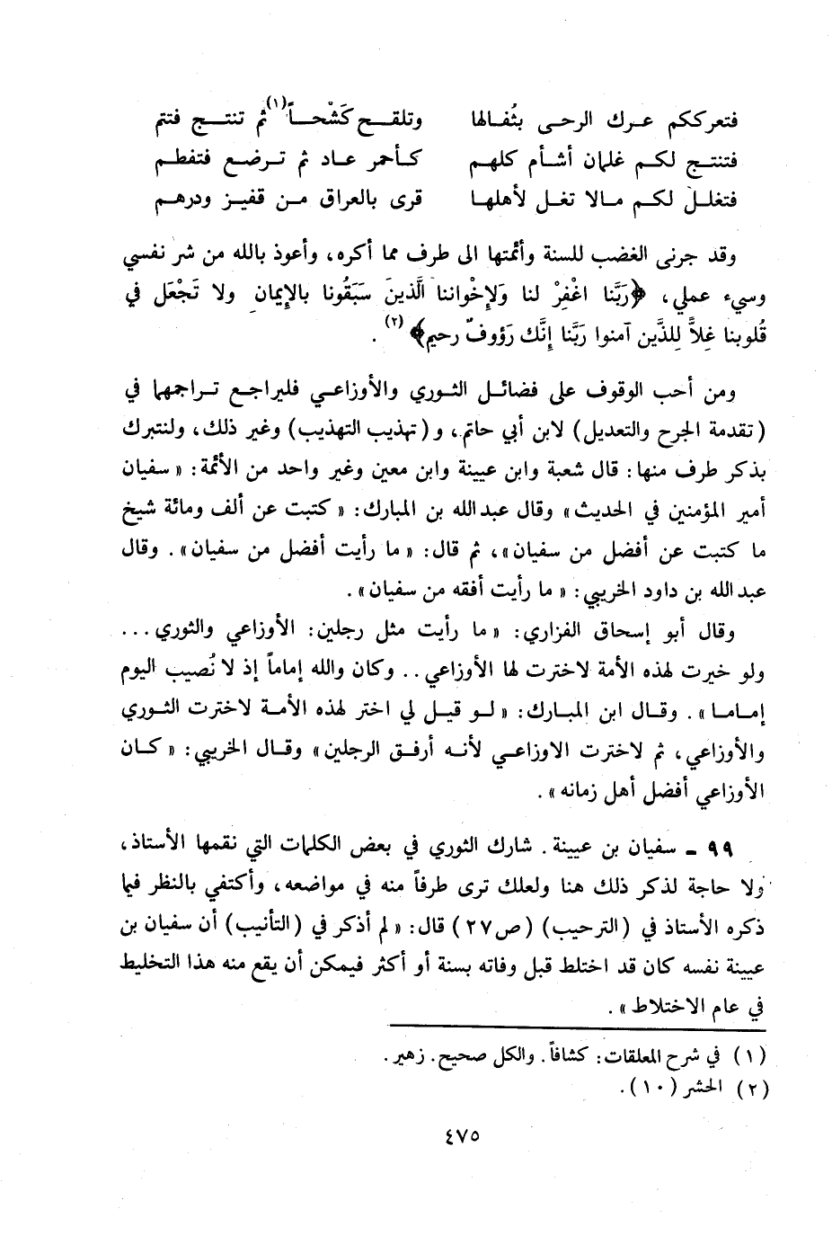 ومن أحب الوقوف على فضائل الثوري والأوزاعي فليراجع تراجمهما في (تقدمة الجرح والتعديل) لابن أبي حاتم، و (تهذيب التهذيب) وغير ذلك، ولنتبرك بذكر طرف منها: قال شعبة وابن عيينة وابن معين وغير واحد من الأئمة: «سفيان أمير المؤمنين في الحديث» وقال عبد الله بن المبارك: «كتبت عن ألف ومائة شيخ ما كتبت عن أفضل من سفيان» ، ثم قال: «ما رأيت من سفيان» . وقال عبد الله بن داود الخريبي: «ما رأيت أفقه من سفيان» .