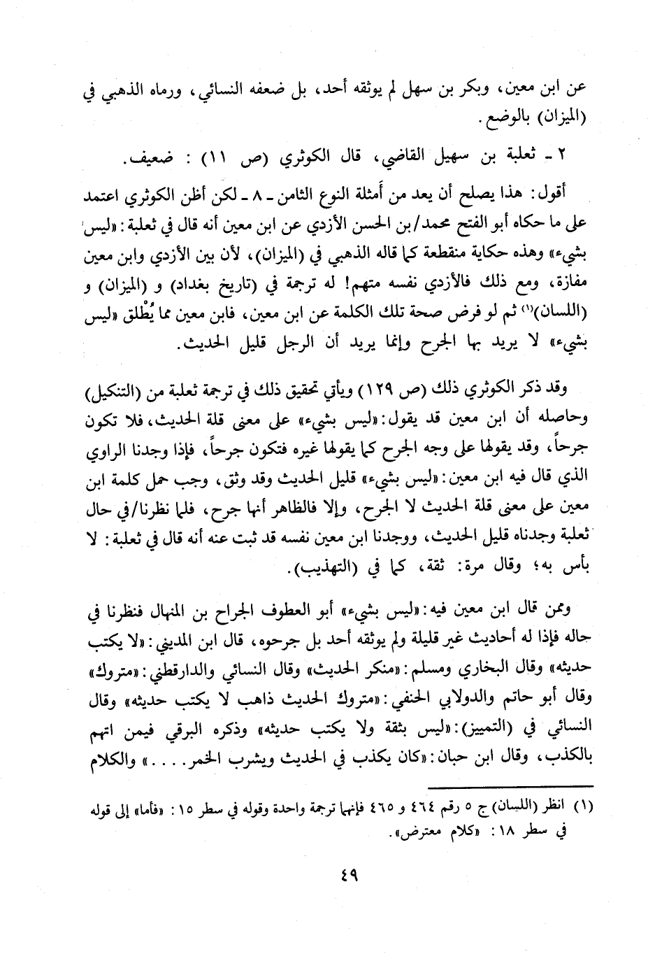 أقول: هذا يصلح أن يعد من أمثلة النوع الثامن - 8 - لكن أظن الكوثري اعتمد على ما حكاه أبو الفتح محمد / بن الحسين الأزدي عن ابن معين أنه قال في ثعلبة «ليس بشيء» وهذه الحكاية منقطعة كما قاله الذهبي في (الميزان) ، لأن بين الأزدي وابن معين مفازة، ومع ذلك فالأزدي نفسه متهم! له ترجمة في (تاريخ بغداد) و (الميزان) و (اللسان) (1) ثم لو فرض صحة تلك الكلمة عن ابن معين، فابن معين مما يطلق «ليس بشيء» لا يريد الجرح وإنما يريد أن الرجل قليل الحديث. وقد ذكر الكوثري ذلك ص 129 ويأتي تحقيق ذلك في ترجمة ثعلبة من (التنكيل) وحاصله أن ابن معين قد يقول «ليس بشيء» على معنى قلة الحديث فلا تكون جرحاً، وقد يقولها على وجه الجرح كما يقولها غيره فتكون جرحاً، فإذا وجدنا الراوي الذي قال فيه ابن معين: «ليس بشيء» قليل الحديث وقد وثق، وجب حمل كلمة ابن معين على معنى قلة الحديث، ووجدنا ابن معين نفسه قد ثبت عنه أنه قال في ثعلبة لا بأس به. وقال مرة: ثقة، كما في (التهذيب) ، وممن قال ابن معين فيه: «ليس بشيء» أبو العطوف الجراح بن المنهال فنظرنا في حاله فإذا له أحاديث غير قليلة ولم يوثقه أحد بل جرحوه، قال ابن المديني: