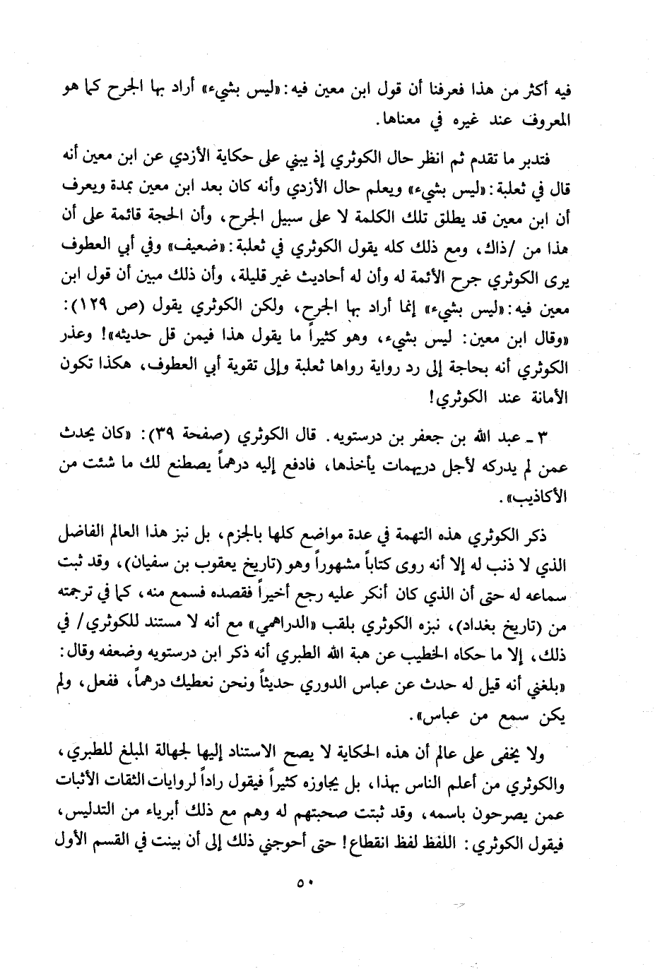 3- عبد الله بن جعفر بن درستويه. قال الكوثري صفحة 39: «كان يحدث عمن لم يدركه لأجل دريهمات يأخذها، فادفع إليه درهماً يصطنع لك ما شيءت من الأكاذيب» ذكر الكوثري هذه التهمة في عدة مواضع كلها بالجزم، بل نبز هذا العالم الفاضل الذي لا ذنب له إلا أنه روى كتاباً مشهوراً وهو (تاريخ يعقوب بن سفيان) ، وقد ثبت سماعه له حتى أن الذي أنكر عليه رجع أخيراً فقصده فسمع منه، كما في ترجمته من (تاريخ بغداد) ، نبزه الكوثري بلقب «الدراهمي» مع أنه لا مستند للكوثري في ذلك، إلا ما حكاه الخطيب عن هبة الله الطبري أنه ذكر ابن درستويه وضعفه وقال: «بلغني أنه قيل له حدث عن ابن عباس الدوري حديثاً ونحن نعطيك درهماً، ففعل، ولم يكن سمع من عباس» .