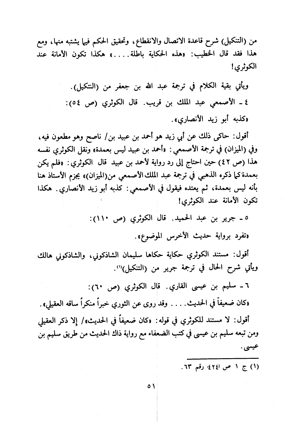 4- الأصمعي عبد الملك بن قريب. قال الكوثري ص 54: «كذبه أبو زيد الأنصاري» .