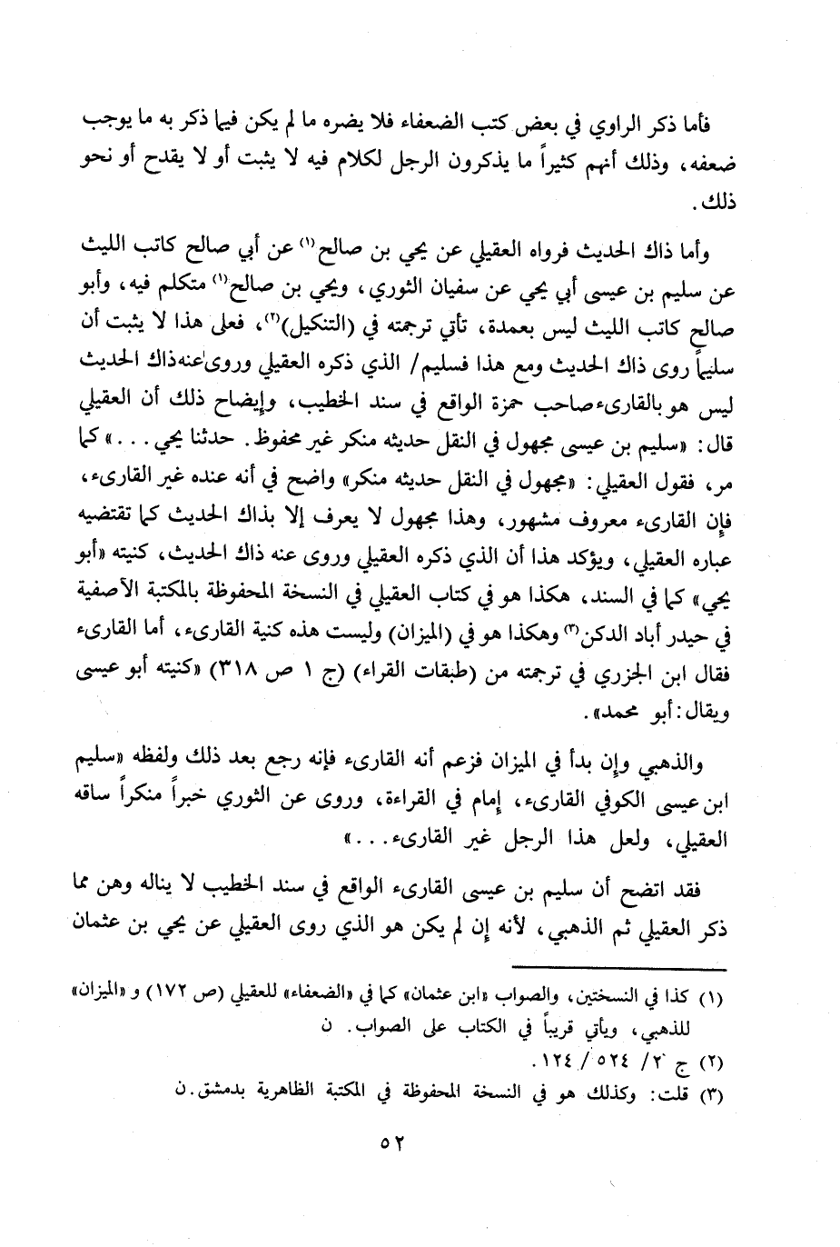 وأما ذاك الحديث فرواه العقيلي عن يحيى بن صالح (1) متكلم فيه وأبو صالح كاتب الليث ليس بعمدة تأتي ترجمته في (التنكيل) (2) ، فعلى هذا لا يثبت أن سليماً روى ذاك الحديث ومع هذا فسليم الذي ذكره العقيلي وروى عنه ذاك الحديث ليس هو بالقارئ صاحب حمزة الواقع في سند الخطيب، وإيضاح ذلك أن العقيلي قال «سليم بن عيسى مجهول في النقل حديثه منكر غير محفوظ. حدثنا يحيى ... » كما مرَّ فقول العقيلي «مجهول في النقل حديثه منكر» واضح في أنه عنده غير القارئ، فإن القارئ معروف مشهور، وهذا مجهول لا يعرف عنه إلا بذاك الحديث كما تقتضيه عبارة العقيلي، ويؤكد هذا أن الذي ذكره العقيلي وروى عنه ذاك الحديث، كنيته " أبو يحيى " كما في السند، هكذا هو في كتاب العقيلي في النسخة المحفوظة بالمكتبة الآصفية في حيدر أباد الدكن (3) وهكذا هو في (الميزان) وليست هذه كنية القارئ، أما القارئ فقال ابن الجزري في ترجمته من (طبقات القراء) ج 1 ص 318 «كنيته أبو عيسى ويقال أبو محمد» .