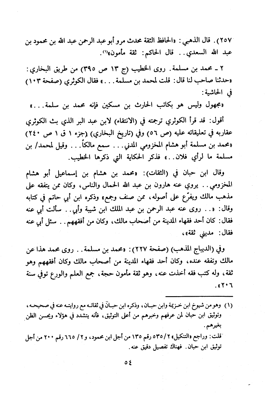 أقول: قد قرأ الكوثري ترجمته في (الانتقاء) لابن عبد البر الذي بث الكوثري عقاربه في تعليقاته عليه 56 وفي (تاريخ البخاري) جزء 1 ق1 ص 240 «محمد بن مسلمة أبو هشام المخزومي المدني ... سمع مالكاً ... وقيل لمحمد / بن مسلمة ما لرأي فلان ... » .