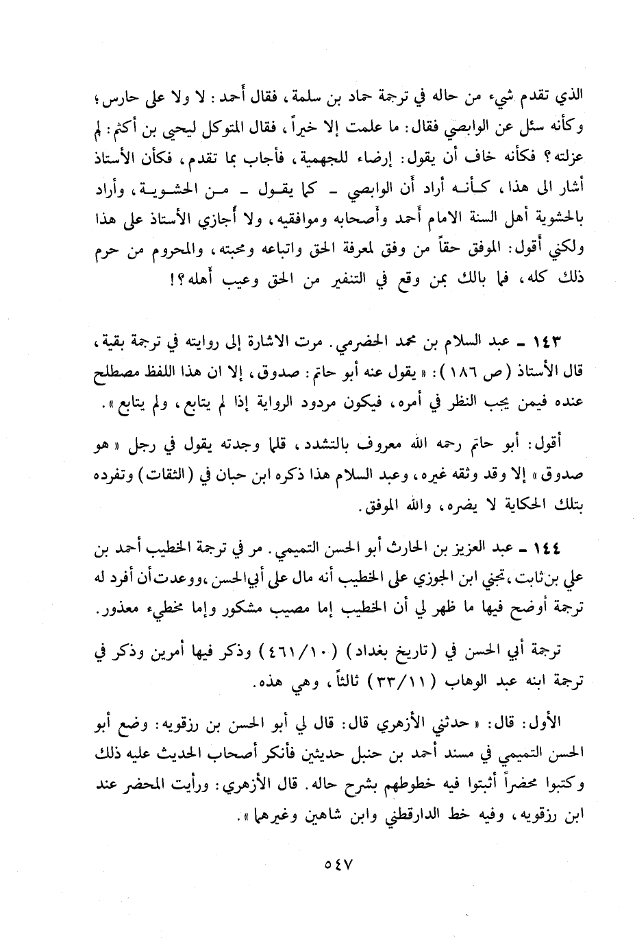 144- عبد العزيز بن الحارث أبو الحسن التميمي. مر في ترجمة الخطيب أحمد بن علي بن ثابت تجني ابن الجوزي على الخطيب أنه مال على أبي الحسن ووعدت أن أفرد له ترجمة أو ضح فيها ما ظهر لي أن الخطيب إما مصيب مشكور وإما مخطئ معذور.