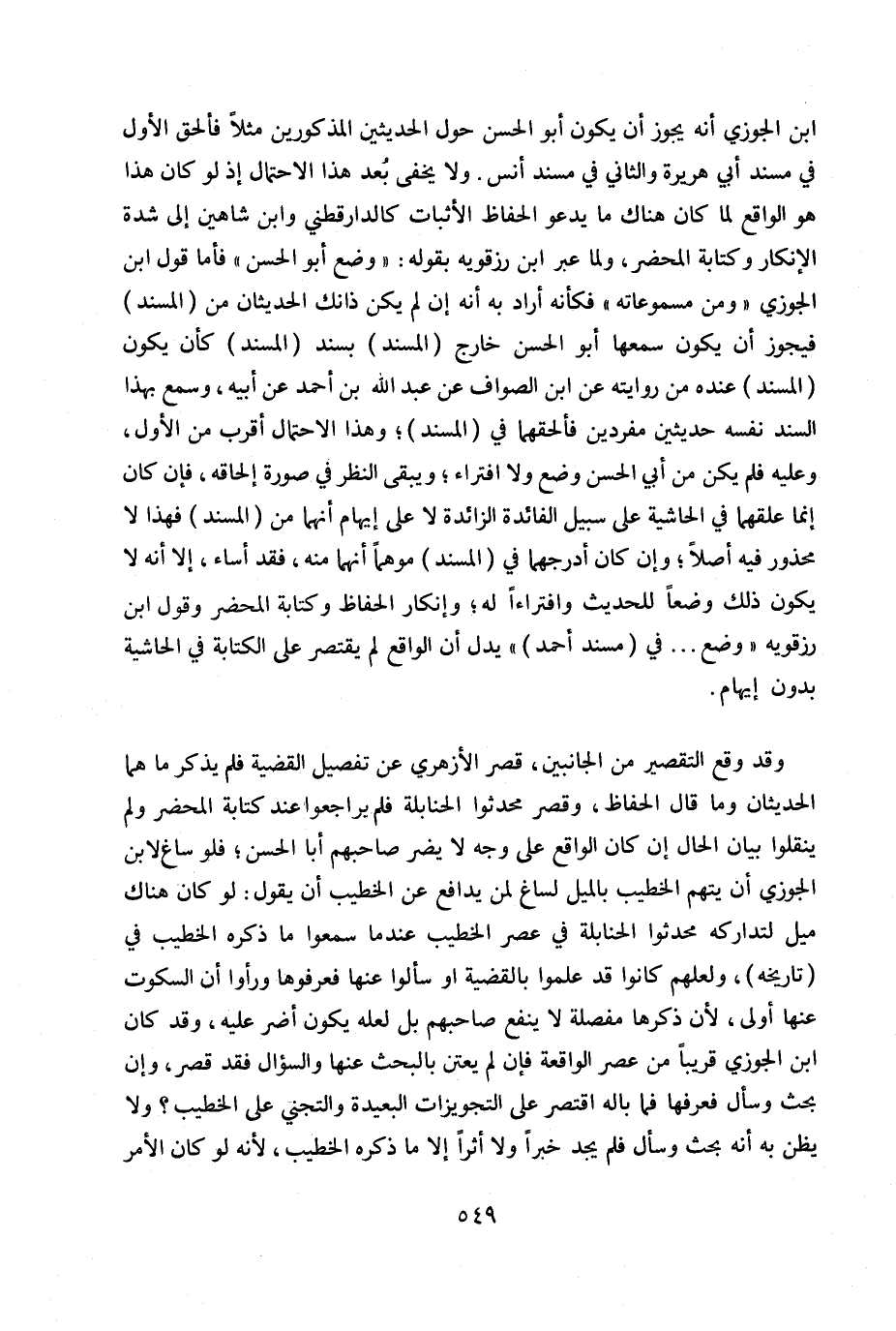 ابن الجوزي أنه يجوز أن يكون أبو الحسن حول الحديثين المذكورين مثلاً فألحق الأول في مسند أبي هريرة والثاني في مسند أنس. ولا يخفى بُعد هذا الاحتمال إذ لو كان هذا هو الواقع لما كان هناك ما يدعو الحفاظ الأثبات كالدارقطني وابن شاهين إلى شدة الإنكار وكتابه المحضر، ولما عبر ابن رزقويه بقوله: «وضع أبو الحسن» فأما قول ابن الجوزي «ومن مسموعاته» فكأنها راد به أنه إن لم يكون ذانك الحديثان من (المسند) فيجوز أن يكون سمعها من أبو الحسن خارج (المسند) بسند (المسند) كأن يكون (المسند) عنده من روايته عن ابن الصواف عن عبد الله بن أحمد عن أبيه، وسمع بهذا السند نفسه حديثين مفردين فألحقهما في (المسند) . وهذا الاحتمال أقرب من الأول، وعليه فلم فلم يكن من أبي الحسن وضع ولا افتراء. ويبقى النظر في صورة إلحاقه، فإن كان أنهما علقهما في الحاشية على سبيل الفائدة الزائدة لا على إيهام أنهما منه، فقد أساء، إلا أنه لا يكون ذلك وضعاً للحديث وافتراءً له. وإنكار الحفاظ وكتابة المحضر وقول ابن رزقويه «وضع ... في (مسند أحمد) » يدل أن الواقع لم يقتصر على الكتابة في الحاشية بدون إيهام.