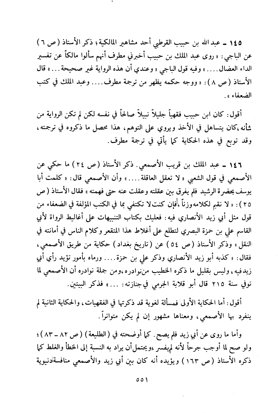 145- عبد الله بن حبيب القرطبي أحد مشاهير المالكية. ذكر الأستاذ ص6 عن الباجي «روى عبد الملك بن حبيب أخبرني مطرف أنهم سألوا مالكاً عن تفسير الداء العضال ... » وفيه قول الباجي «وعندي أن هذه الرواية غير صحيحة ... » قال الأستاذ ص8 «ووجه حكمه يظهر من ترجمة مطرف ... وعبد الملك في كتب الضعفاء» .