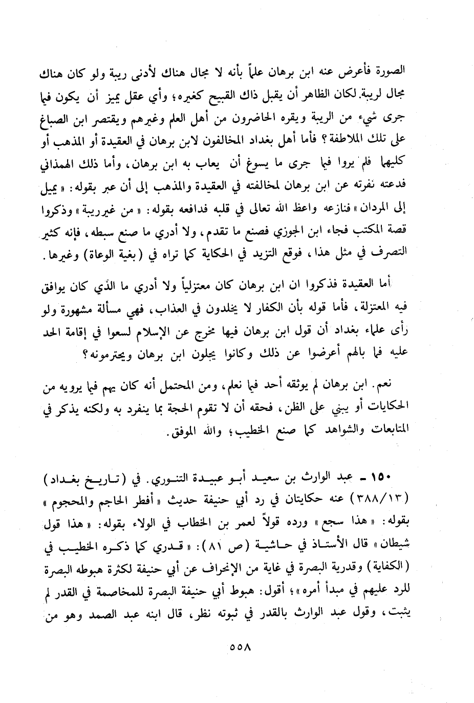 150- عبد الوارث بن سعيد أبو عبيدة التنوري. في (تاريخ بغداد) (13 / 388) عنه حكايتان في رد أبي حنيفة حديث «أفطر الحاجم والمحجوم» بقوله: «هذا سجع» ورده قولاً لعمر بن الخطاب في الولاء بقوله «هذا قول شيطان» بقوله: «هذا سجع» ورده قولاً لعمر بن الخطاب في الولاء بقوله: «هذا قول شيطان» قال الأستاذ في حاشية ص 81: «قدري كما ذكره الخطيب في (الكفاية) وقدرية البصرة في غاية من الانحراف عن أبي حنفية لكثرة هبوطه البصرة للرد عليهم في مبدأ أمره» ؛ أقول: هبوط أبي حنيفة البصرة للمخاصمة في القدر لم يثبت، وقول عبد الوارث بالقدر في ثبوته نظر، قال ابنه عبد الصمد وهو من
