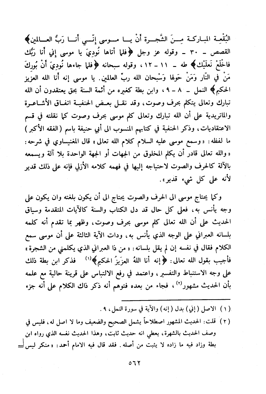 وكما يحتاج موسى إلى الحرف والصوت يحتاج إلى أن يكون بلغته وان يكون على وجه يأنس به. فعلى كل حال قد دل الكتاب والسنة كالآيات المتقدمة وسياق الحديث على أن الله تعالى كلم موسى بحرف وصوت، وظهر بما تقدم أنه كلمه بلسانه العبراني على الوجه الذي يأنس به. ودلت الآية الثالثة على أن موسى سمع الكلام فقال في نفسه إن لم يقل بلسانه: «من ذا العبراني الذي يكلمني من الشجرة» فأجيب بقول الله تعالى: «إنه (1) أنا الله العزيز الحكيم» فذكر ابن بطة ذلك على وجه الاستنباط والتفسير، واعتمد في رفع الالتباس على قرينة حالية مع علمه بأن الحديث مشهور (2) فجاء من بعده فنوهم أنه ذكر الكلام على أنه جزء