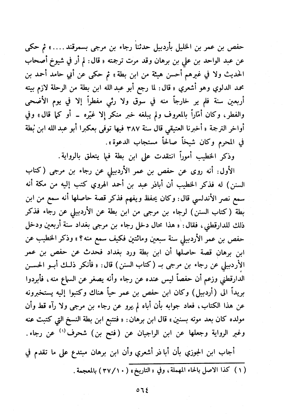 قال: وكان يحفظ ويفهم فذكر قصة حاصلها أنه سمع من ابن بطة (كتاب السنن) لرجاء بن مرجى من ابن بطة عن الأردبيلي عن رجاء فذكر ذلك للدارقطني، قال: «هذا محال دخل رجاء بن مرجى بغداد سنة أربعين ودخل حفص بن عمر الأردبيلي سنة سبعين ومائتين فكيف سمع منه؟» وذكر الخطيب عن ابن برهان قصة حاصلها أن ابن بطة ورد بغداد فحدث عن حفص بن عمر الأردبيلي عن رجاء بن مرجئ (كتاب السنن) قال: «فأنكر ذلك أبو الحسن الدارقطني وزعم أن حفصاً ليس عنده عن رجاء وأنه يصغر عن السماع منه، فابردوا بريداً إلى (أردبيل) وكان ابن حفص بن عمر حياً هناك وكتبوا غليه يستخبرونه عن هذا الكتاب، فعاد جوابه بأن أباه لم يرو عن رجاء بن مرجى ولا رآه قط وأن مولده كان بعد موته بسنين» قال ابن برهان: «فتتبع ابن بطة النسخ التي كتبت عنه وغير الرواية وجعلها عن ابن الراجيان عن (فتح بن) شحرف (1) عن رجاء.